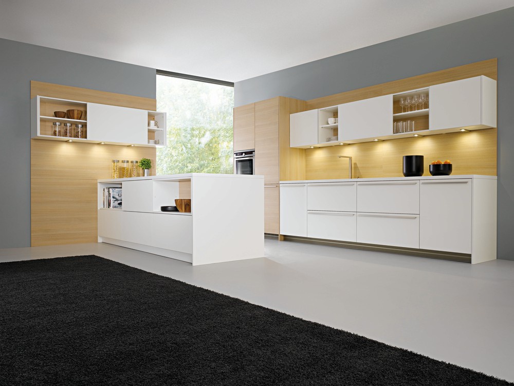 Set for the kitchen from the German manufacturer Leicht Kuechen AG. The model with the island. Material - solid wood. The surface is covered with Matt lacquered white. Accessories metal. There is built-in backlight. Made in a modern style.
