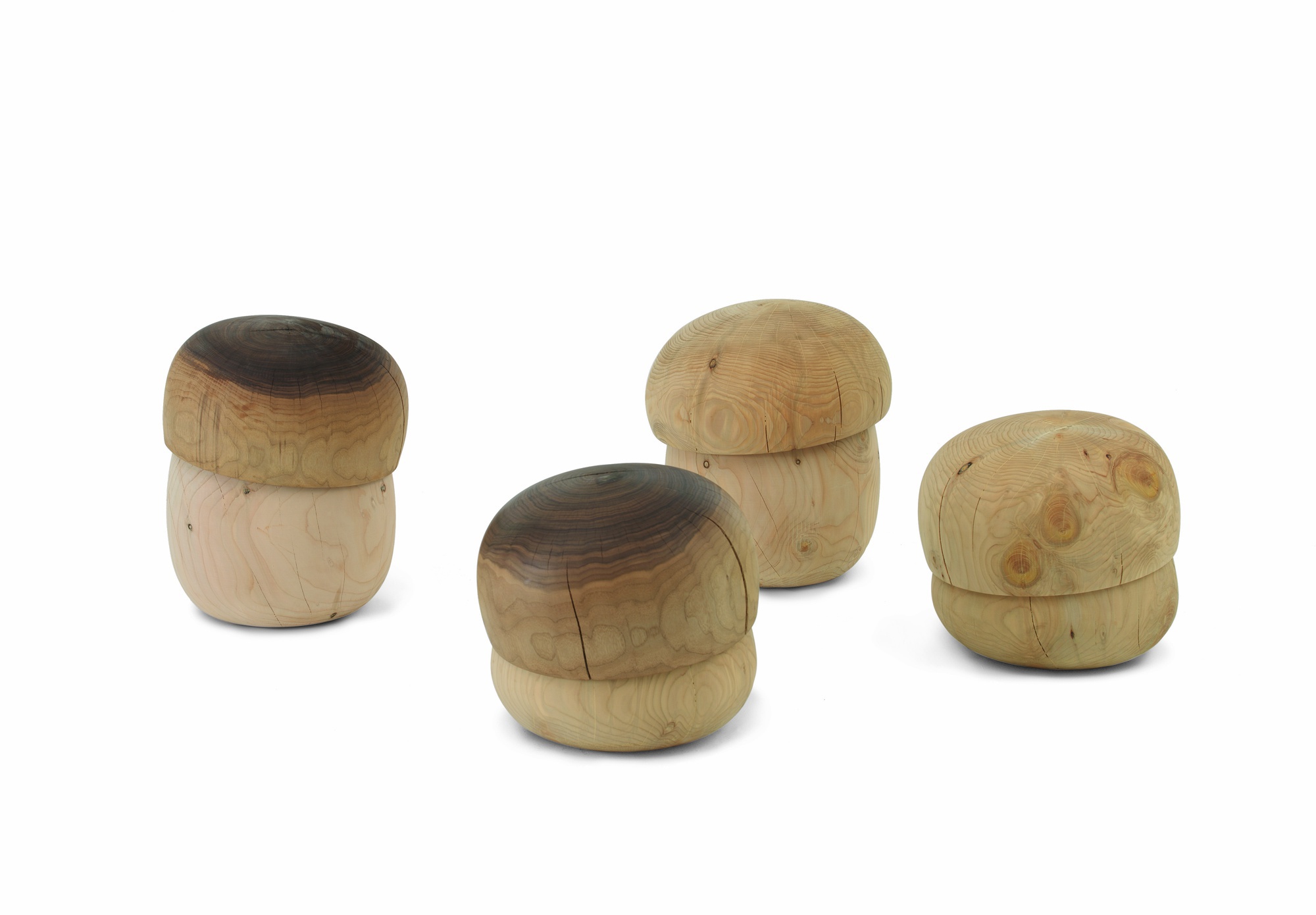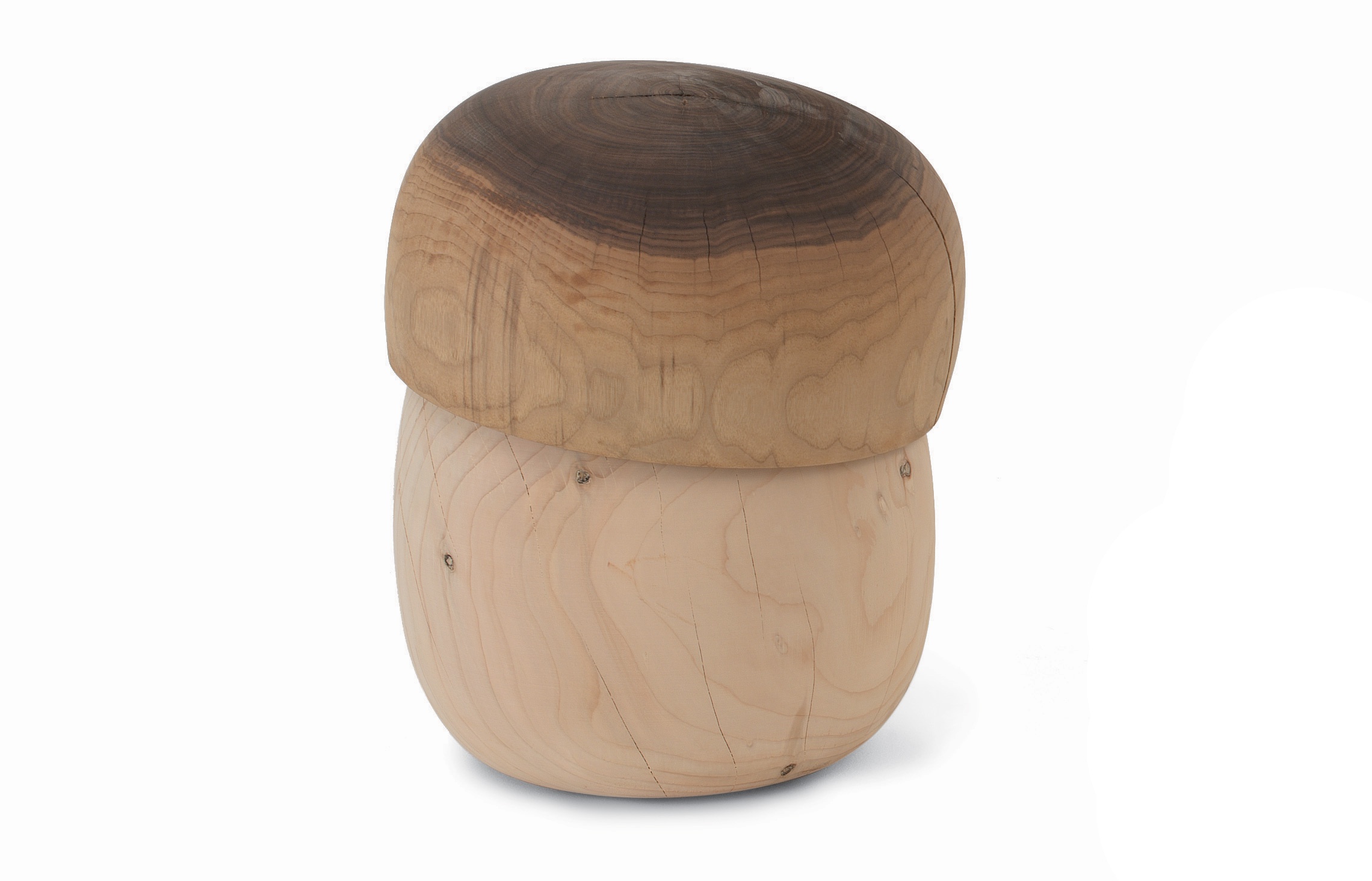 The Fungo stool from the Italian manufacturer Riva 1920. The model is presented in two versions: completely from solid cedar and the product with a base of solid cedar wood and seat made of walnut. The style is modern.