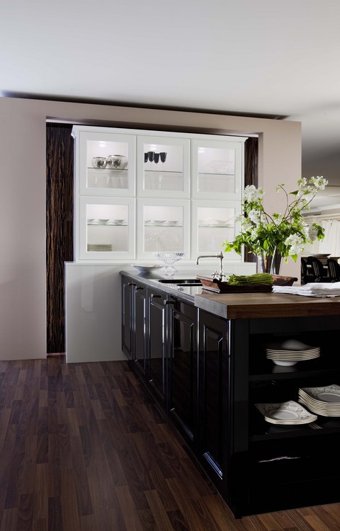 Set for the kitchen from the German manufacturer Leicht Kuechen AG. The model is made in a modern style.Material - solid wood. Fold the top shelves and drawers made of transparent glass. Accessories metal. The surface is covered with a glossy lacquer white.