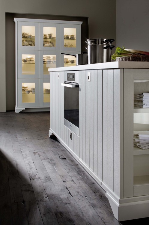 Set for the kitchen from the German manufacturer Leicht Kuechen AG. The model is made in modern style. Includes island and showcases. The housing modules is made from solid wood. The surface of the varnished white and brown colors. Accessories metal. Shutters and shelves made of solid wood and glass. The design has built-in backlight.
