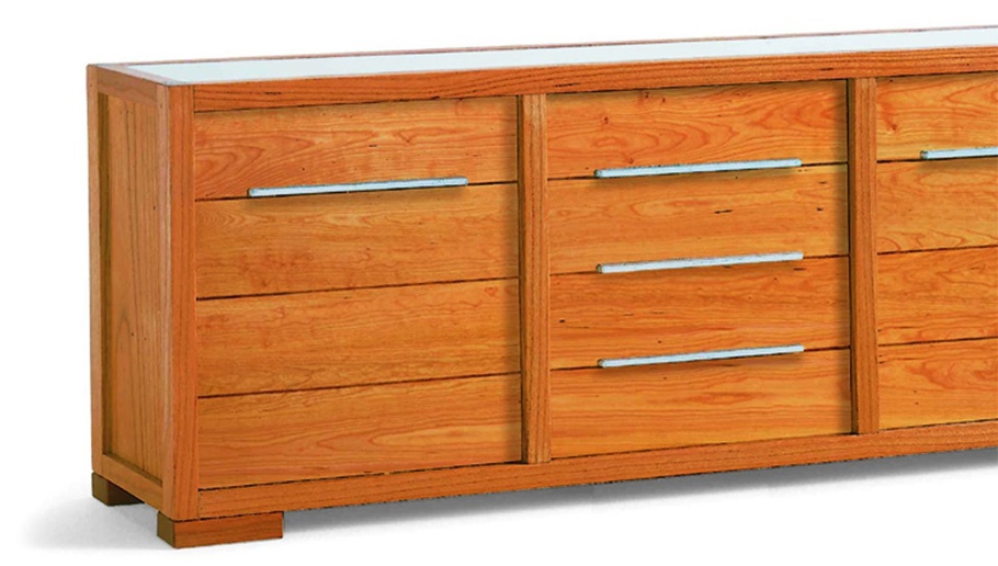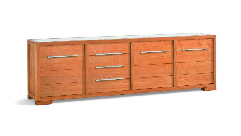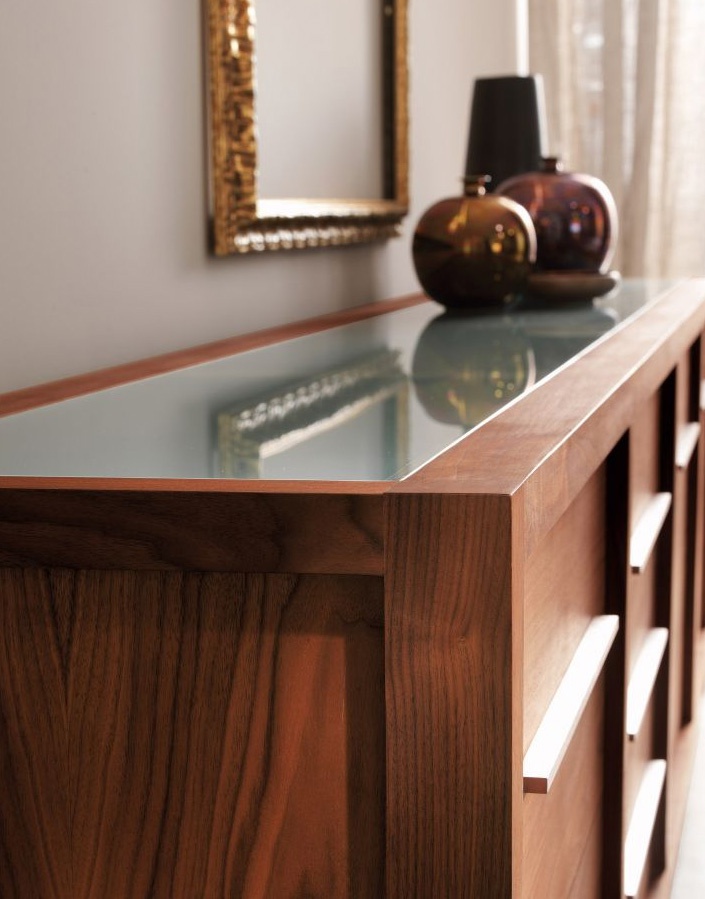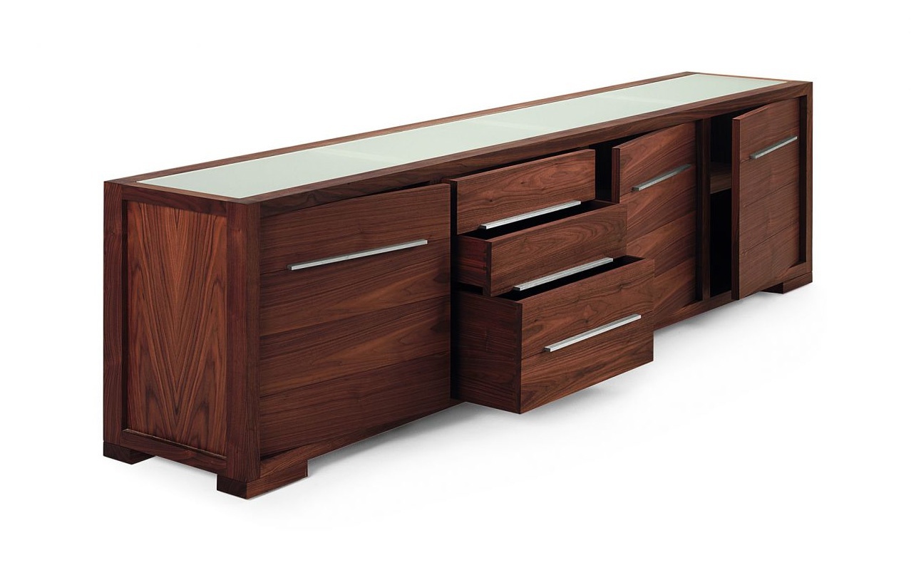 Cupboard for living room Cerfoglio from the Italian manufacturer Riva 1920. Made of solid wood with hinged doors and drawers. Worktop - tempered glass. Model with clear straight lines in a modern style. The color of natural wood.