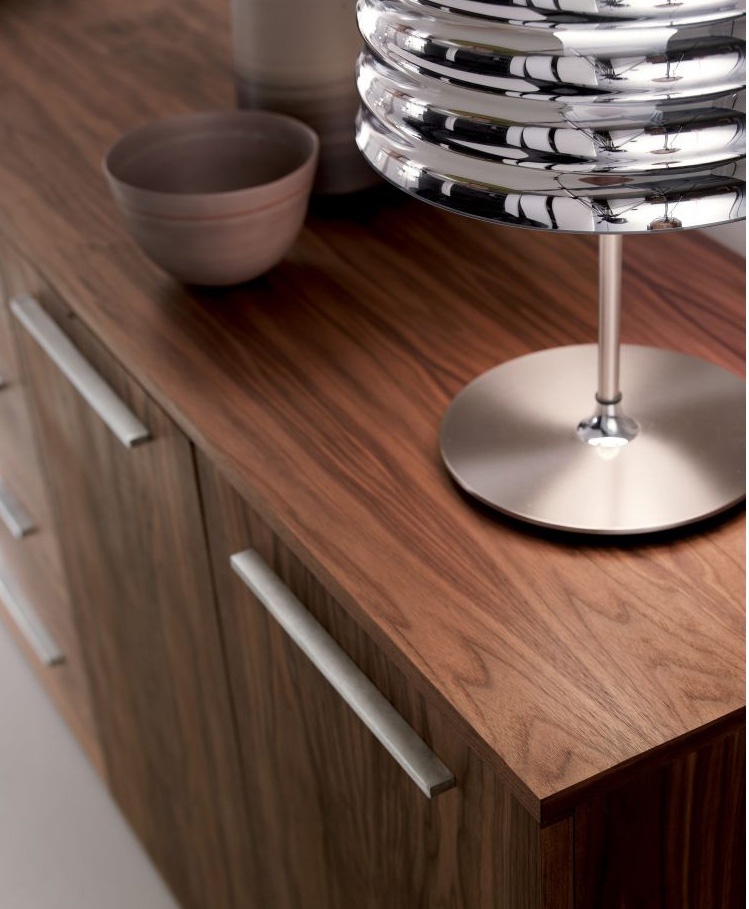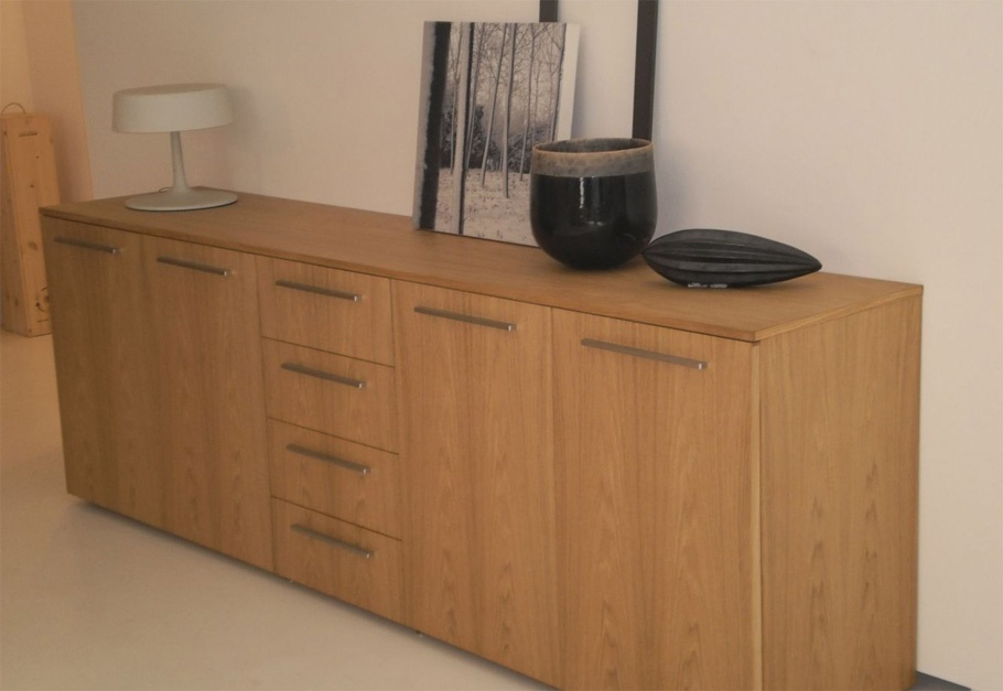Cupboard for living room Leonardo from the Italian manufacturer Riva 1920. Made of solid wood with four drawers and four hinged doors. The perfect choice for a living room in modern style. The color of natural wood.