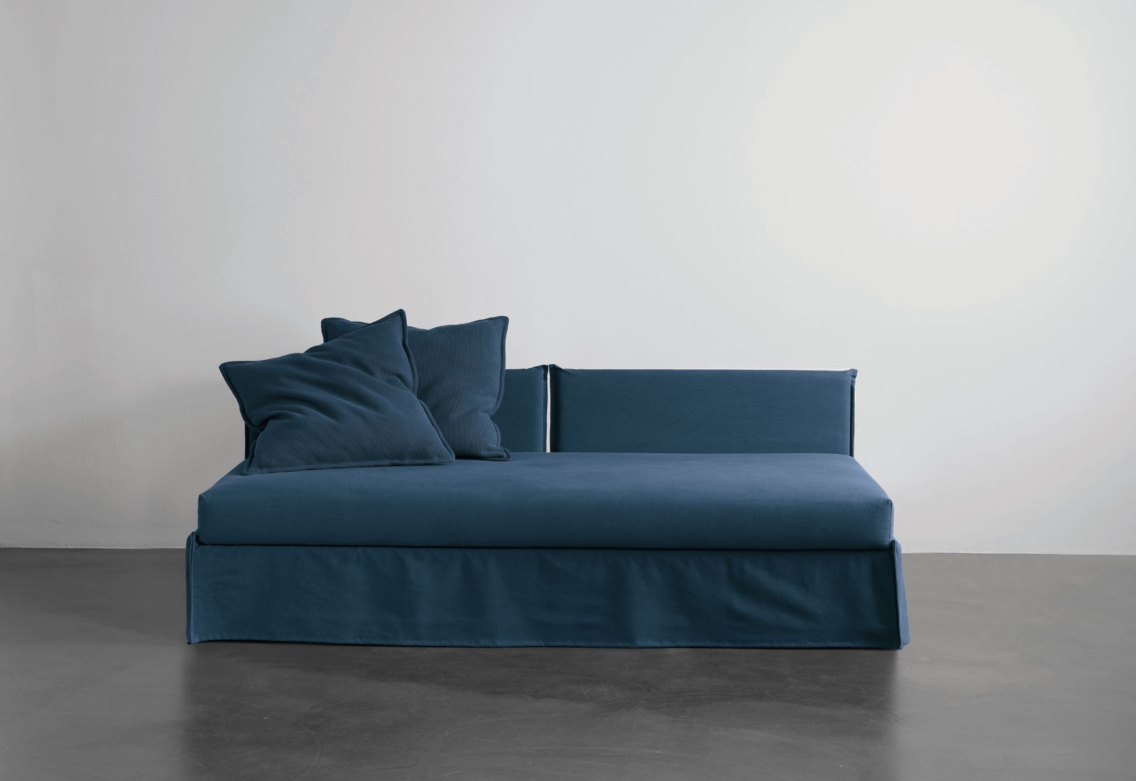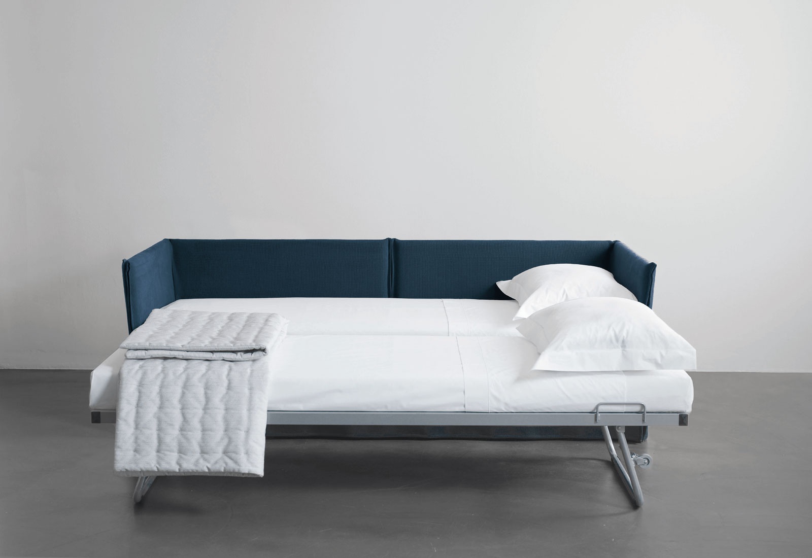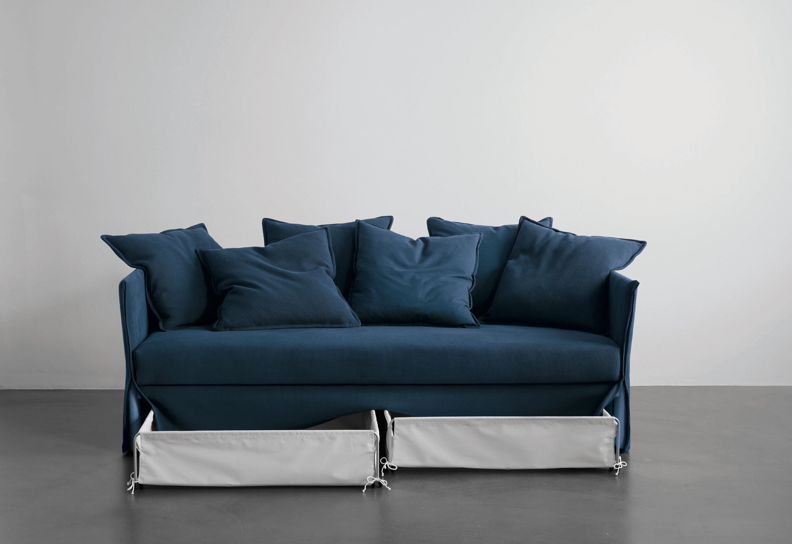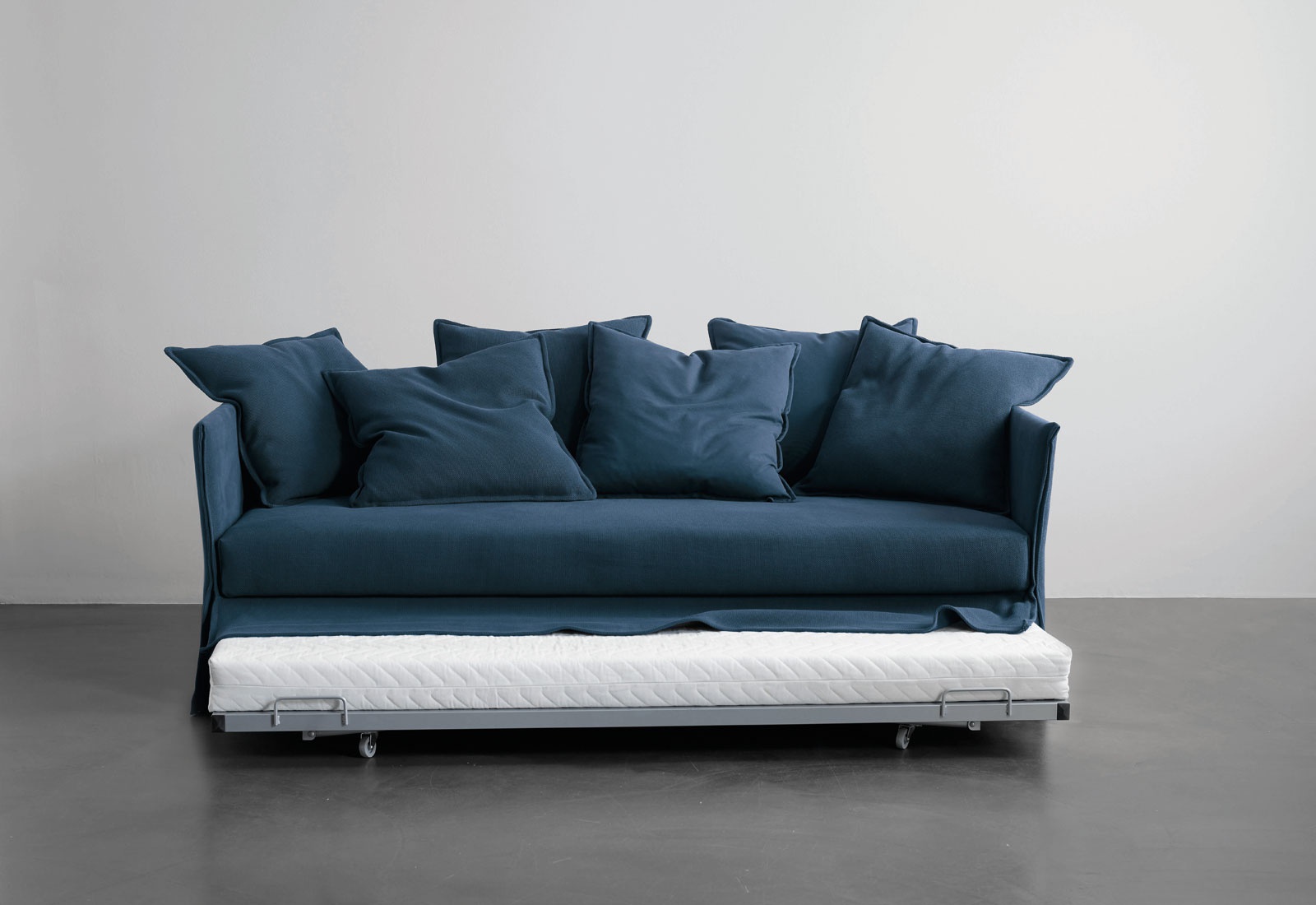 Sofa bed Fox from the Italian manufacturer Meridiani. The frame is made of wood and metal with slatted base. Upholstery - textiles. The style is modern. Colours in stock.