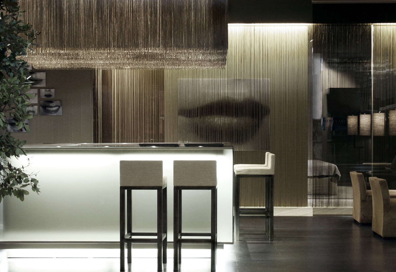Cage bar stool from the Italian manufacturer Meridiani. Legs, frame - natural wood. Upholstery - textiles. The model is made in modern style. Colours in stock.