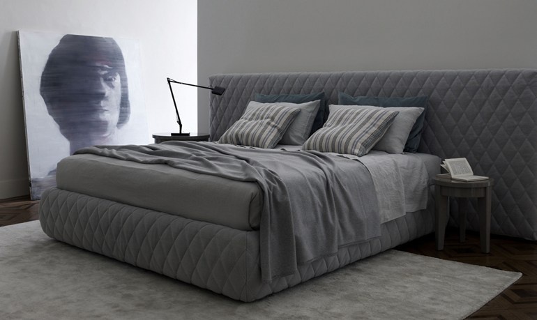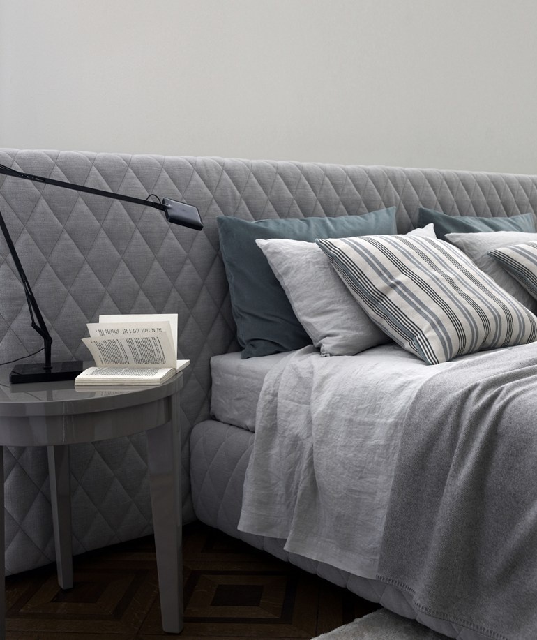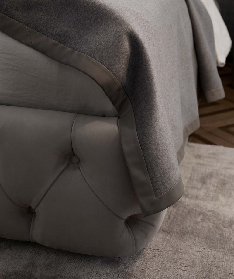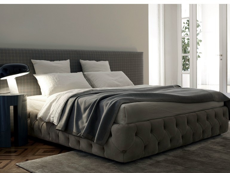 The TUYO bed from Italian manufacturer Meridiani. The frame is made of natural wood, upholstery - textiles from a range of campaigns. Double model with upholstered headboard and tufted surface. Made in a modern style. Colours in stock.
