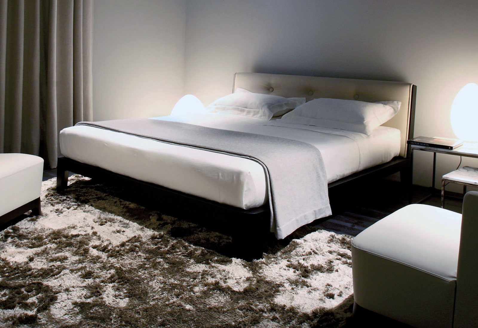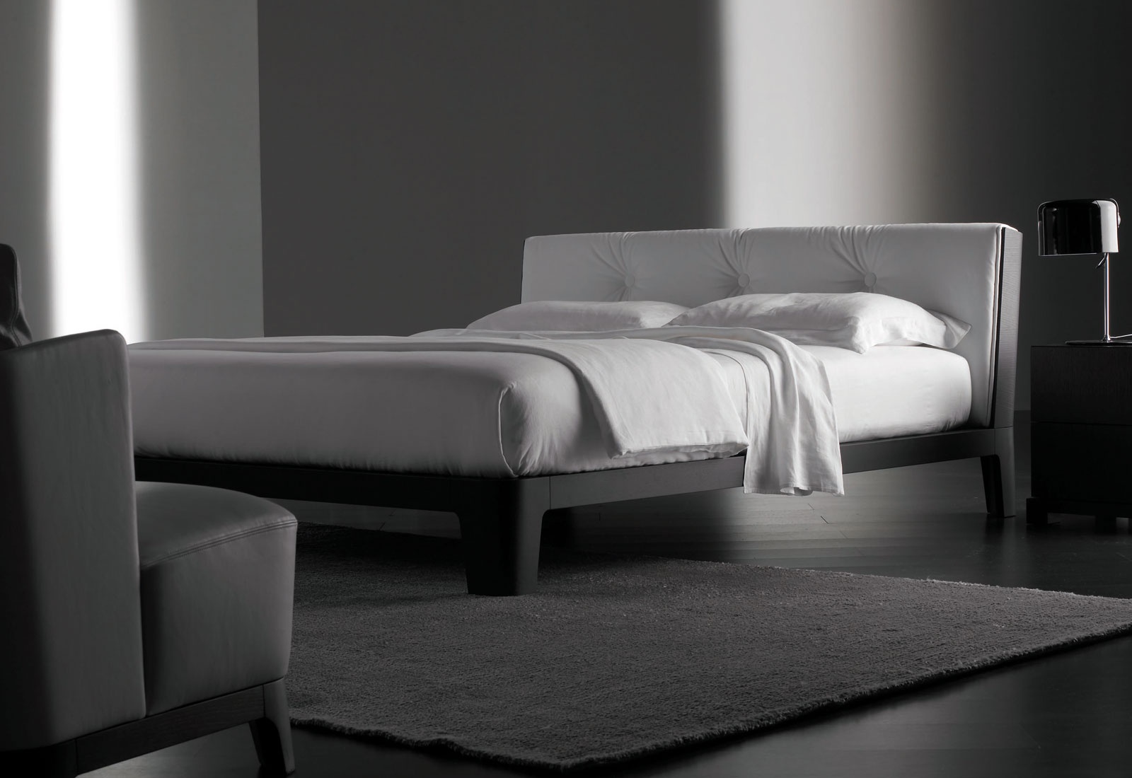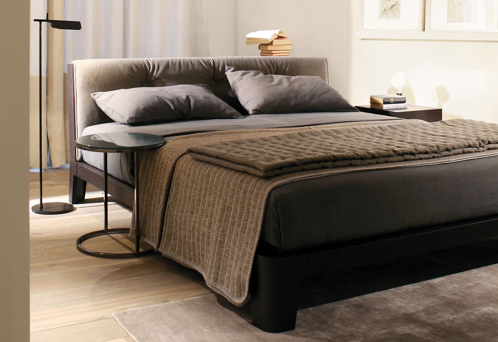 Winger Wood bed from Italian manufacturer Meridiani. The body is made of mahogany (mahogany), upholstery - textiles or leather from a range of campaigns. Double model with upholstered headboard is the perfect choice for the bedroom in modern style. Colours in stock.