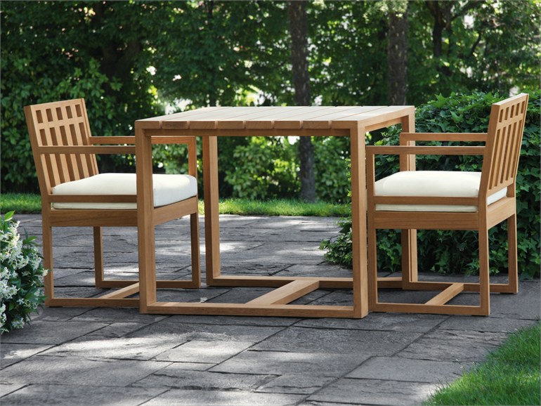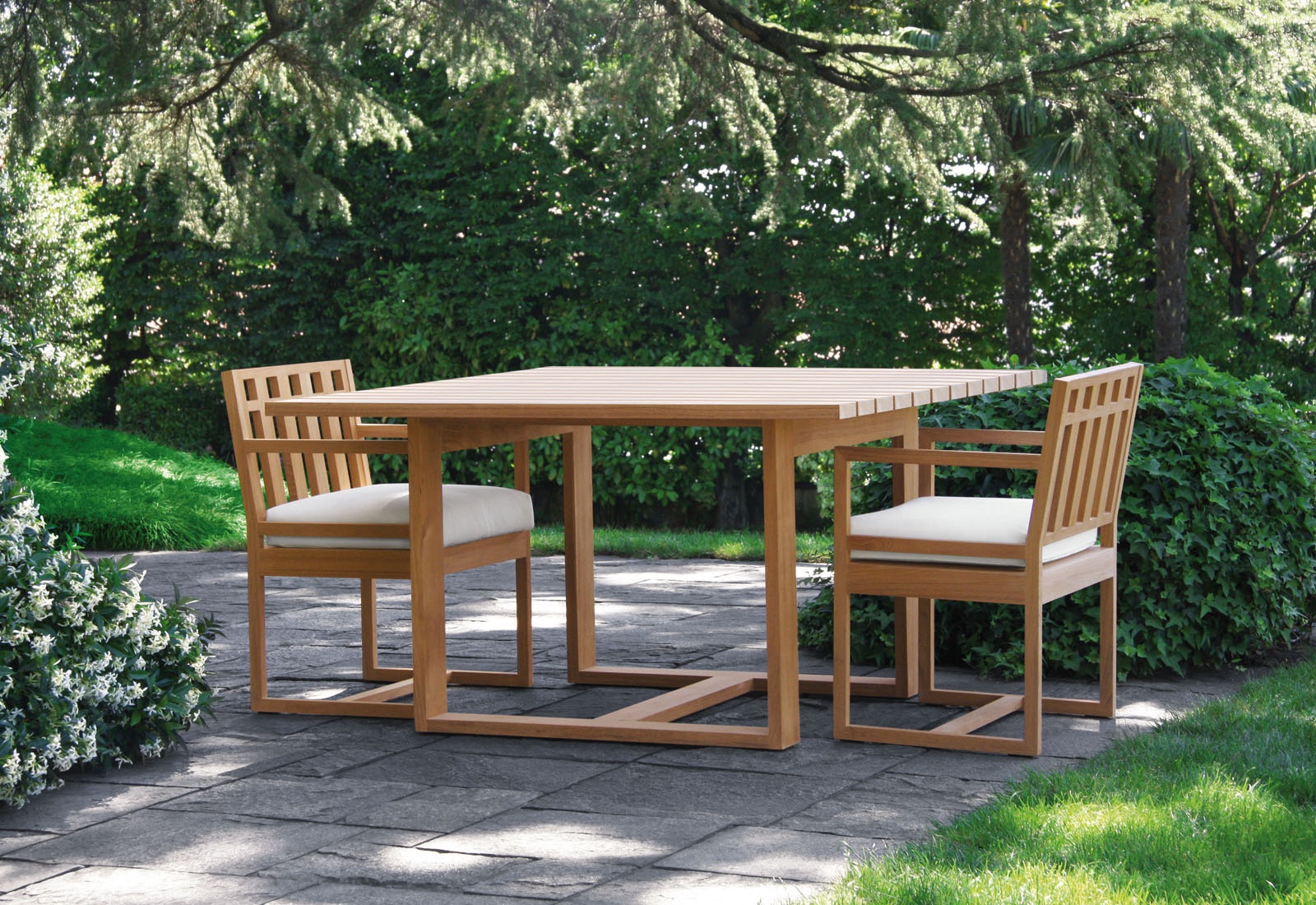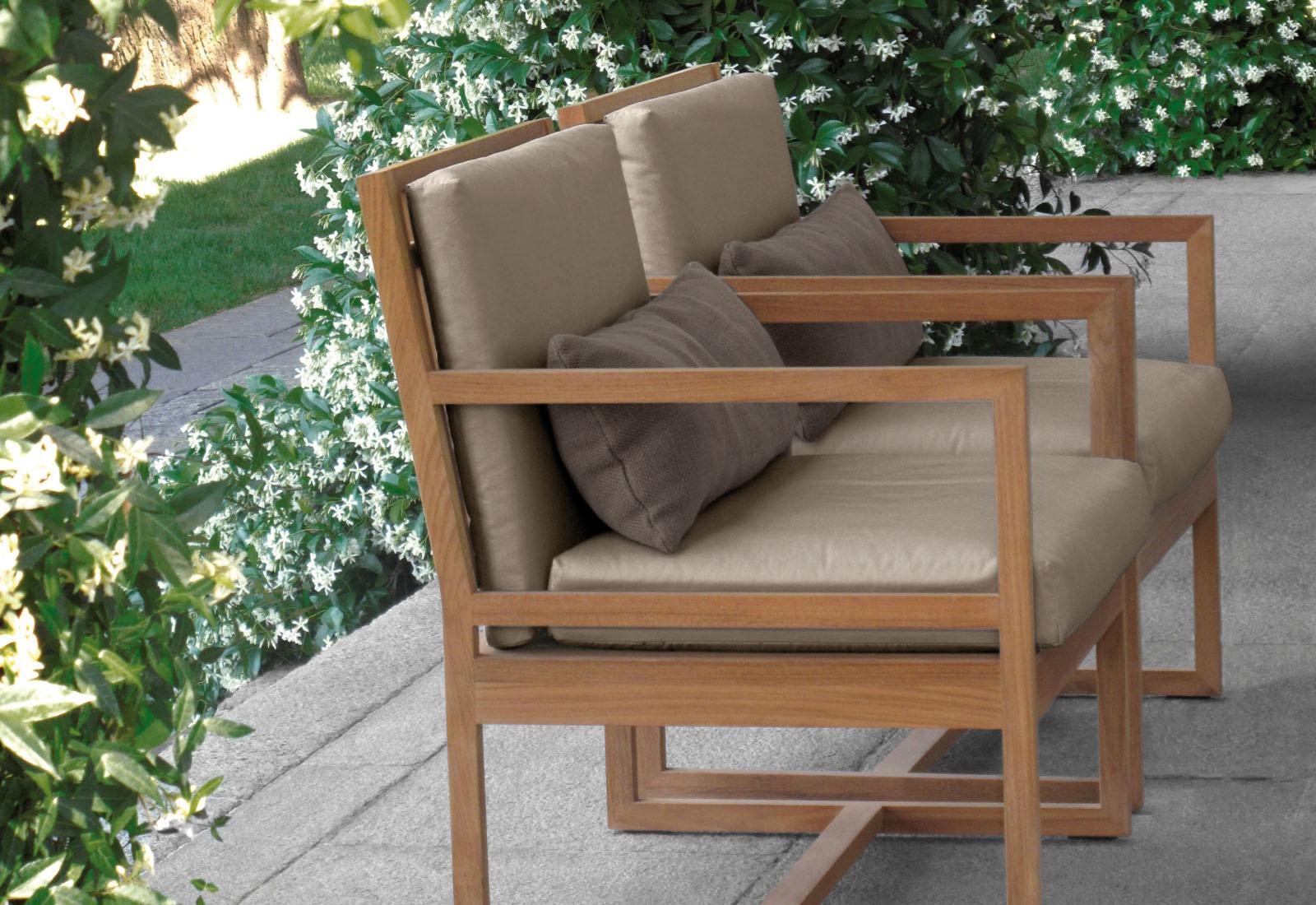 Chair for garden Square from the Italian manufacturer Meridiani. Legs, frame - natural wood. Padding - water repellent fabric. The model is made in Bungalow-style. Colours in stock.
