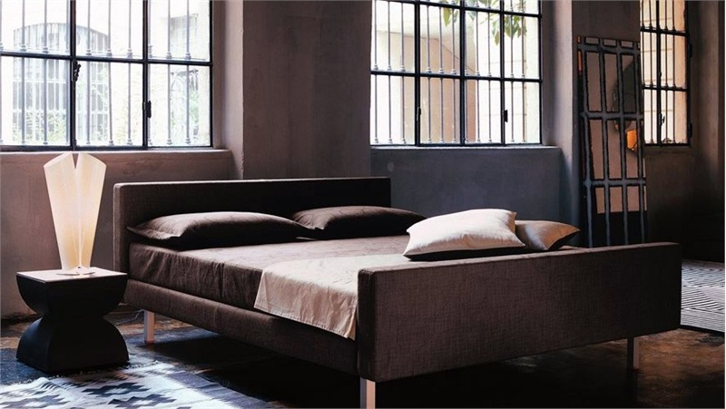 Bed Colony from the Italian manufacturer Mussi. Bed on steel frame, painted by powder method. Ambassademonaco legs in aluminium painted in silver color, the lower part wood. The base under the mattress laminated beech slats. The frame of the headboard, sides and base made from wood and poplar plywood. The filler of polyurethane foam and nylon.