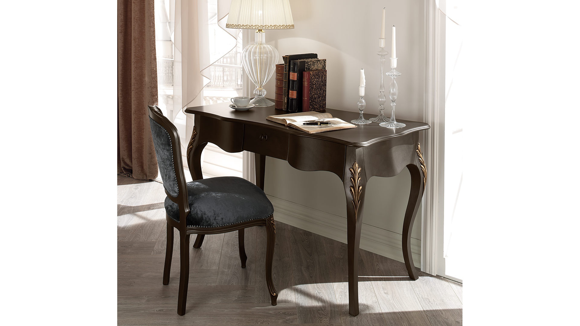 Desk Gregory from the Italian manufacturer Cantori. The model is made of solid wood. Legs in the form of Cabriole. Finish - Matt lacquer. The style is art Deco. Colours in stock.