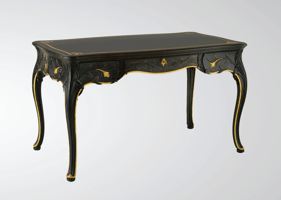 Desk table from the Italian manufacturer Chelini. Model with drawers. Figured rectangular top and legs made from solid wood. The surface artificially aged. Color - black. Carved decorative elements in gilt. Handles are metal. The style is classic.