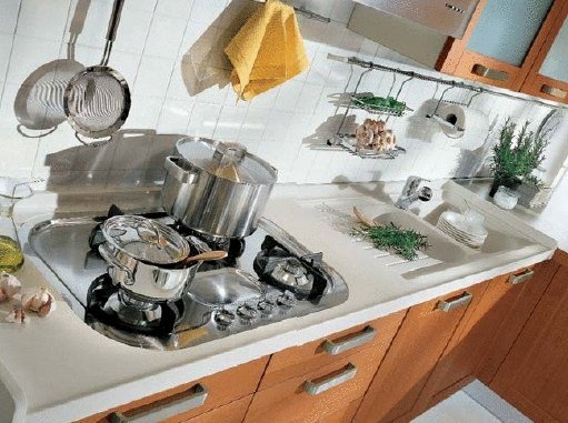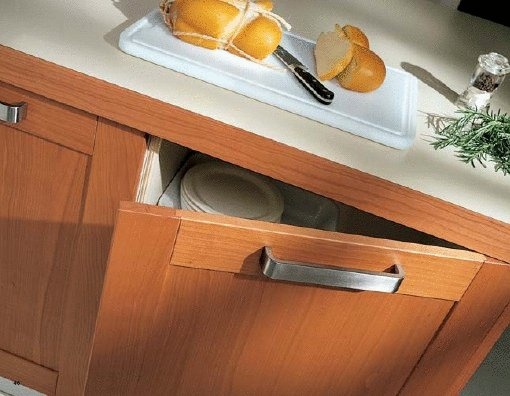 Borda kitchen from Italian manufacturer Pedini. This model is made on a frame of particle Board in melamine finish. Options door smooth veneer in cherry or beech veneered frame laminated in multiple shades of white, ivory or gray, the edges of dichroic cherry one strip is darker, the other lighter glass with frame in cherry or beech. Drawers complemented by closers. Wide door handles and drawers are made of metal. Stainless steel countertop, granite, marble or artificial stone Cristalan , Quarzite porcelain tiles, laminated finish under the wood.