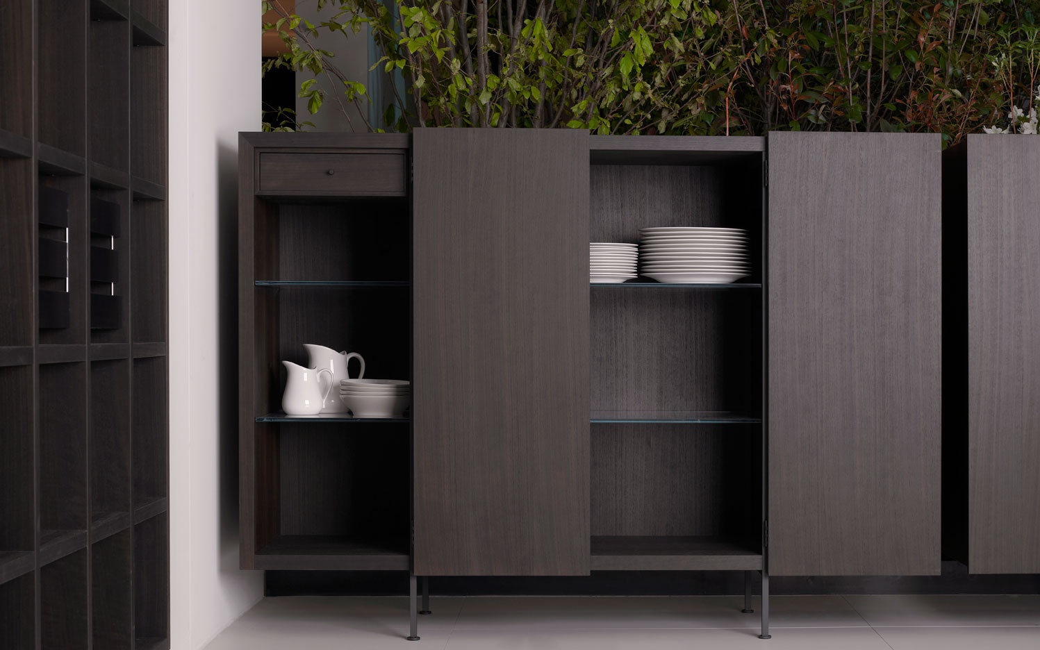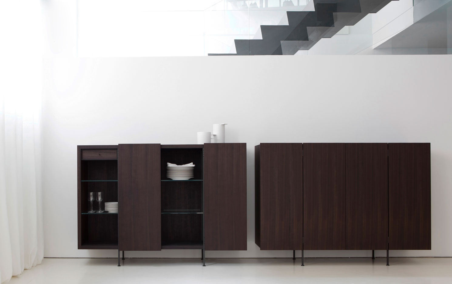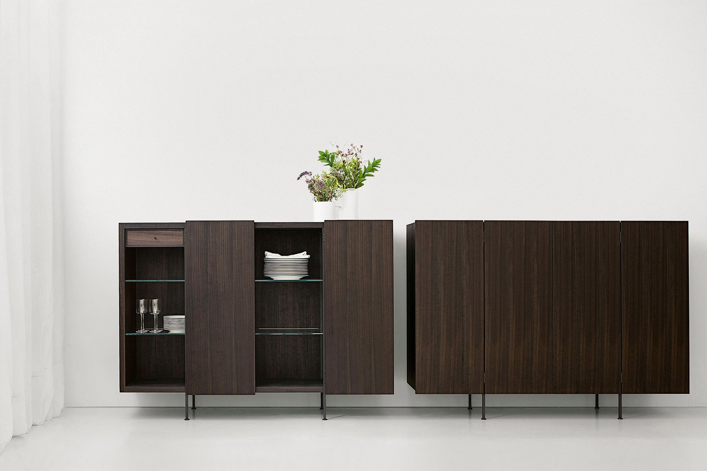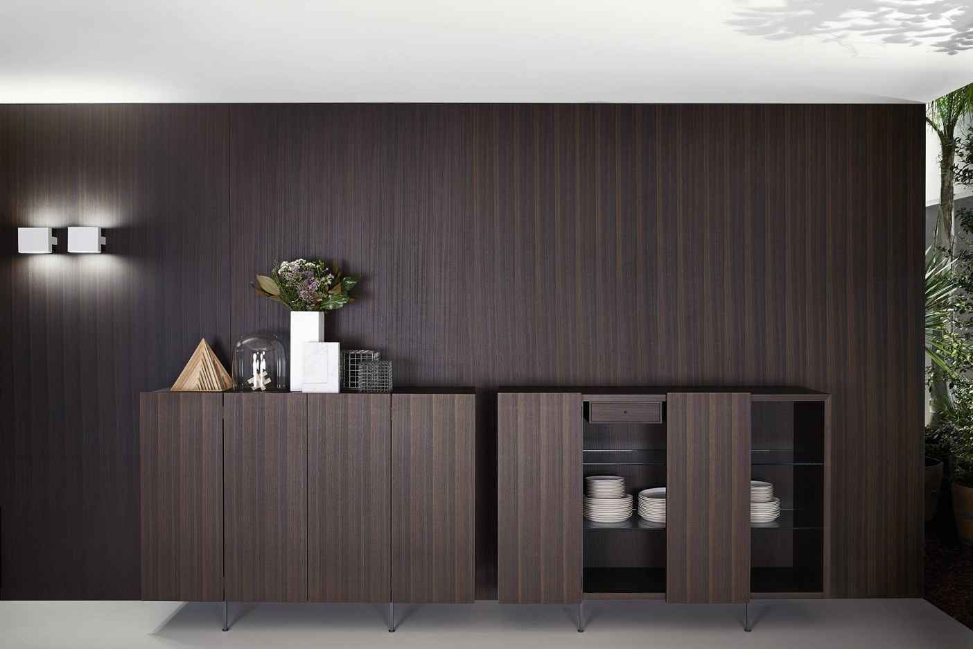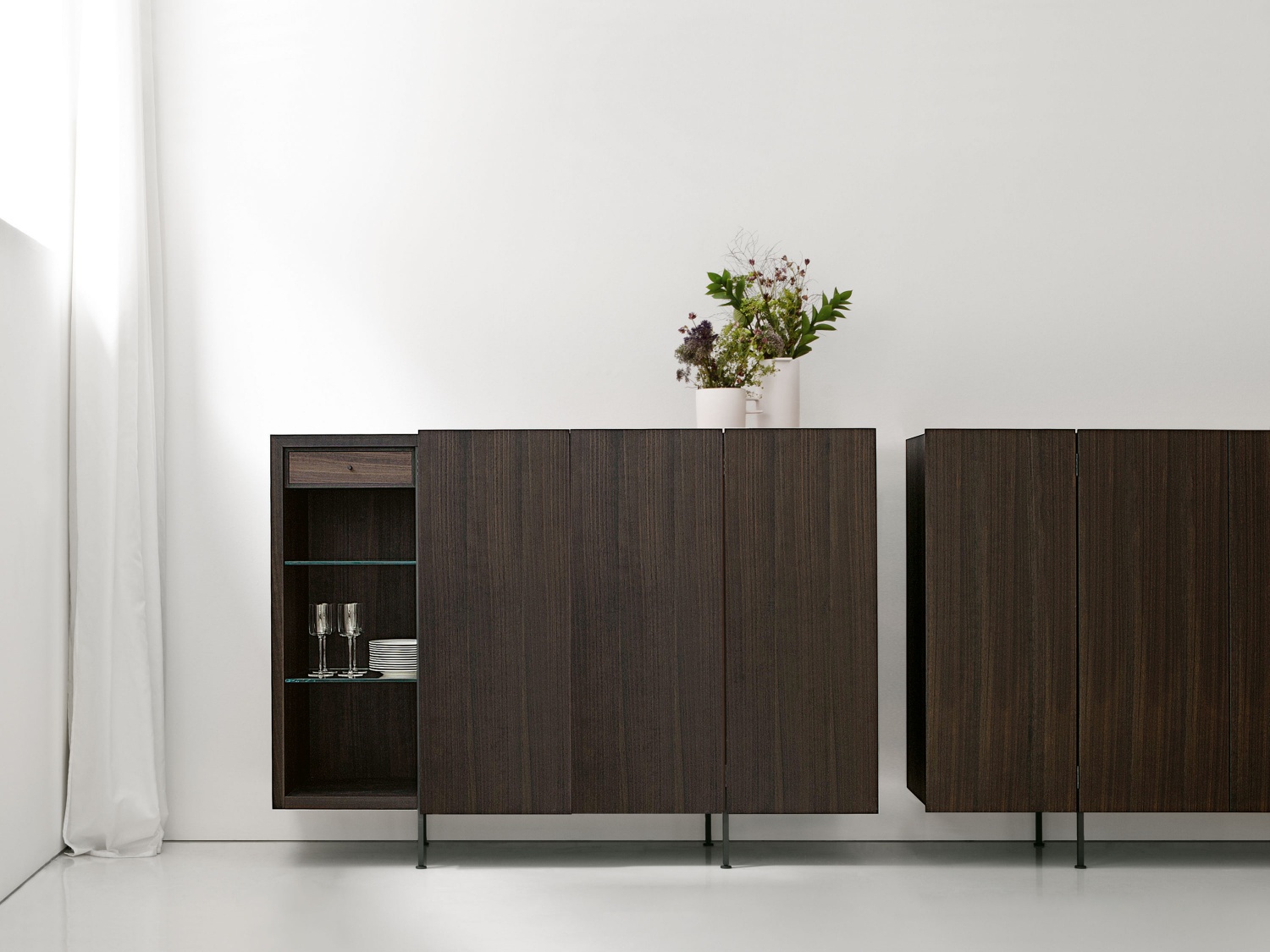 Cabinet Tiller from Italian manufacturer Porro. The case is natural wood. Shelves - tempered glass. Legs - metal. Finish - Matt lacquer. The model is made in modern style. Colours in stock.