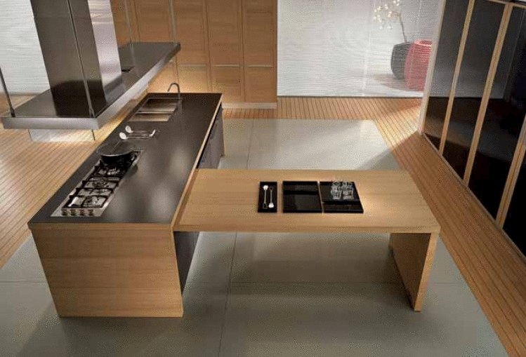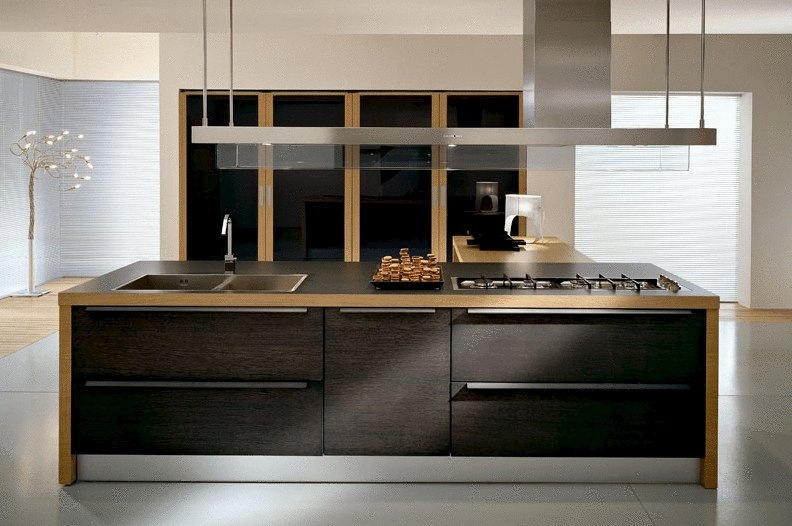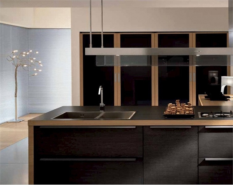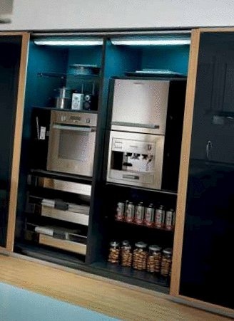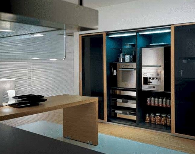 Integra kitchen from Italian manufacturer Pedini. Kitchen set on a frame of particle Board in melamine finish. Options doors: veneer bright, white, black, silver or white oak. Possible matte or high gloss. Drawers complemented by closers. Stainless steel countertop, granite, marble, artificial stone. Also a possible choice in several versions worktops composite Cristalan and Quarzite porcelain tiles, laminate in the finish of the wood.