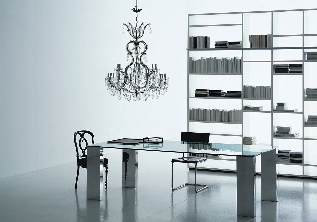 Beam dining table from Italian manufacturer Porro. Legs - chrome steel. Worktop - glass. The model is made in modern style. Colours in stock.