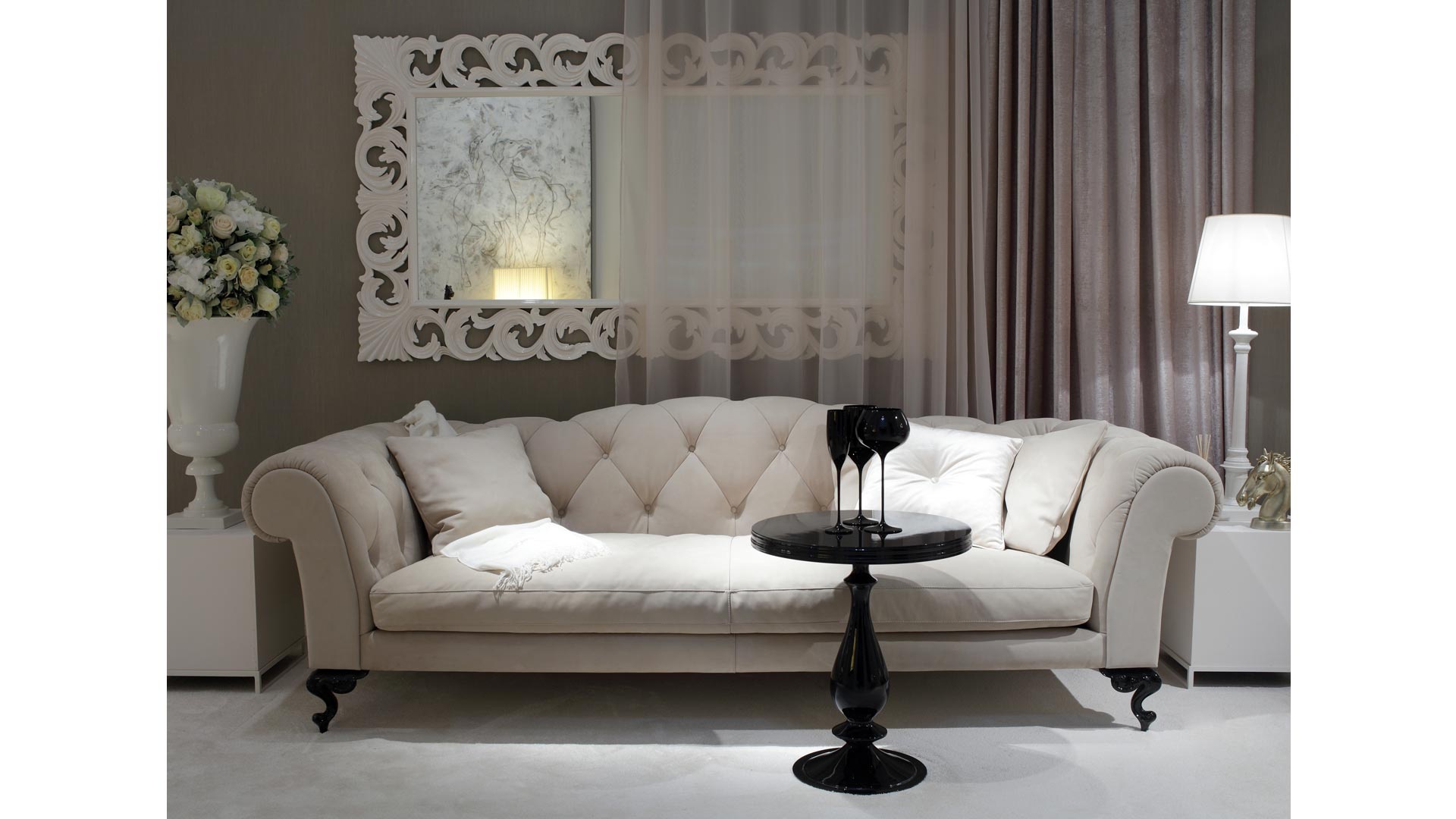The George sofa from Italian manufacturer Cantori. The frame is made of wood. The legs are cast bronze. Model with a rounded back which fades into the armrests. Upholstery textile from the collection of firm - decorated with stitch Capito. Filler - polyurethane foam. Complement the design of decorative pillows. Beautiful decoration modern interior.