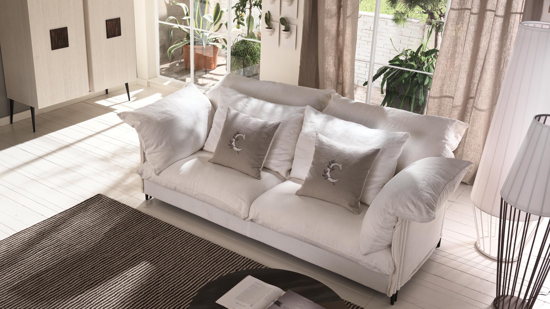 The Tango sofa from Italian manufacturer Cantori. The frame is made of wood, filler - foam, upholstery - textiles from a range of campaigns. The seats are removable. Elegant model living room in the neoclassical style. The design of complementary decorative pillows. Product color white.