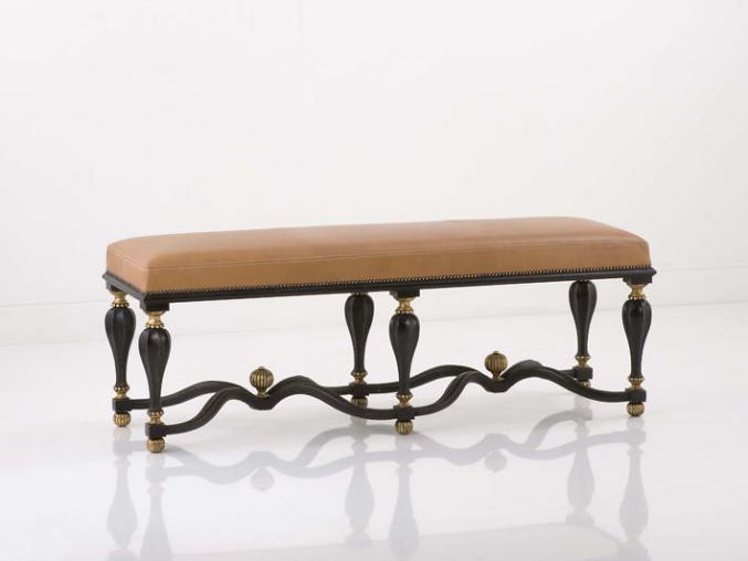 Bench from the Italian manufacturer Chelini. The model is made in classic style. The frame and legs of solid wood. The surface is covered with a glossy varnish. Color - black, gold. Seat upholstered, covered with textile or leather.
