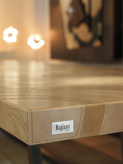 Decoro dining table Riscio, from the Italian manufacturer Rugiano. The base of the table is made of chromium steel or bronze. The table top is rectangular in shape, in finish leather of various colors. Factory offers two sizes. Excellent solution for your dining room or living room in modern style.