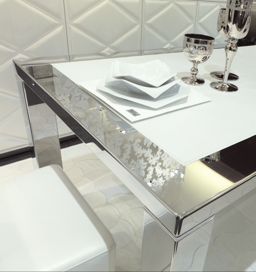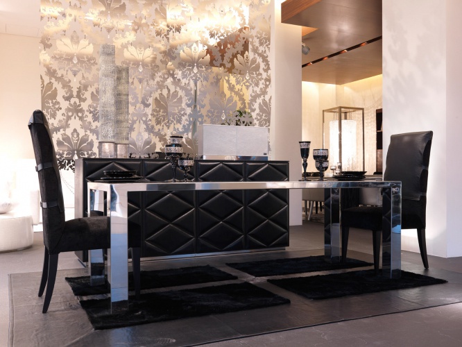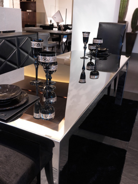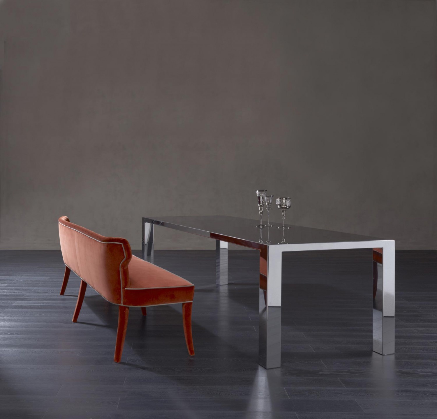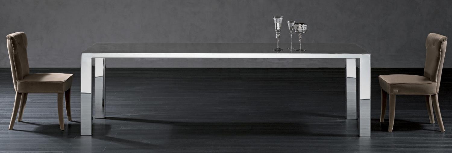 Narciso dining table from Italian manufacturer Rugiano. The table is available in two versions: entirely in chrome steel or with a leather inset on top. The thickness of the table top 5 see a Great option for Your living room or dining room in contemporary style with hints of glamour.