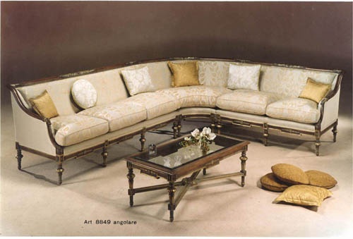 Sofa set 8849 from the Italian manufacturer Allievi. Set includes: sofa, two armchairs and a coffee table. Materials: natural wood, and textiles. The tree is decorated with hand-carved finish lacquer. The style is classic. Colours in stock.