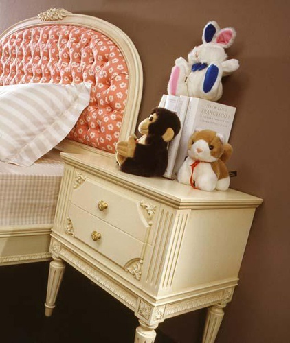 Set for the nursery Hello from the Italian manufacturer Allievi. Set includes: bed, dresser, wardrobe, armchair and two chairs. Materials: natural wood, and textiles. The tree is decorated with hand-carved finish lacquer. The furniture in classic style. Colours in stock.