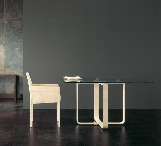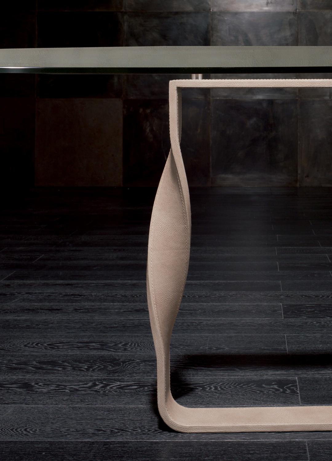 Nokido dining table from Italian manufacturer Rugiano. The table top made from 15 mm. tempered glass. Base on twisted legs made of bronze and covered with leather. Color to be selected from the company directory. Comfortable and functional, the table will adorn your living room or dining room in contemporary style.