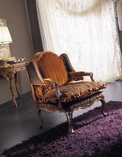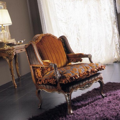 | Description: | The chair DE-1955/101 from the Italian manufacturer Fratelli Allievi. A Bergere armchair with low-slung in the Rococo style. Material - natural wood. The frame and legs are finished in Cabriole thread and decorated with textured silver finish. Curly back, the plugs on the sides, carved armrests with soft pads. Textile upholstery in orange-brown tones trimmed with orange fringe. Colors and detail in the photo. |