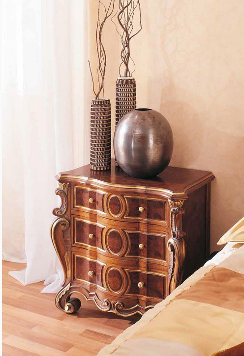 Headsets sleeping Aureola - AU-2004 from the Italian manufacturer Fratelli Allievi. Set includes double bed, two bedside tables and a chest of drawers. Made of solid wood in Baroque style. Upholstery - textiles. The tree is decorated with inlaid and hand-carved finish lacquer. Colours in stock.