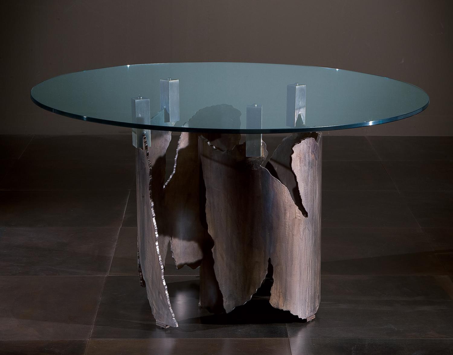 Dining table with glass top Giorgio, from the Italian manufacturer Rugiano. Laid the basis for iron with bronze or steel. The base is made in the form of tree bark. Table top made from 15 mm. tempered glass round, oval or rectangular shape. The table will add a zest to your interior, give personality.
