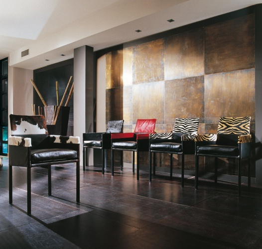 Chair with armrests Akita, from the Italian manufacturer Rugiano. Model with a high square back and armrests. The walls were covered with skin, colors to choose from the catalog factory. The back of the chair and armrests are decorated with inserts of structural skin. Practical and comfortable chair ideal for the living room or dining room in contemporary style.
