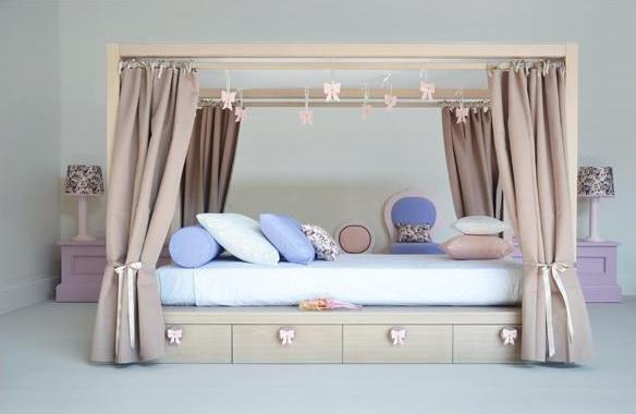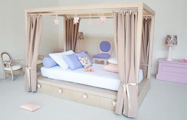Children canopy bed from Italian manufacturer Anna Baby Room. The model is made in classic style. The frame is made from solid wood. Finish to be selected from a catalog company. Canopy textile. Complement the design of the lockers. Decoration are the decorative handles in the shape of a butterfly.