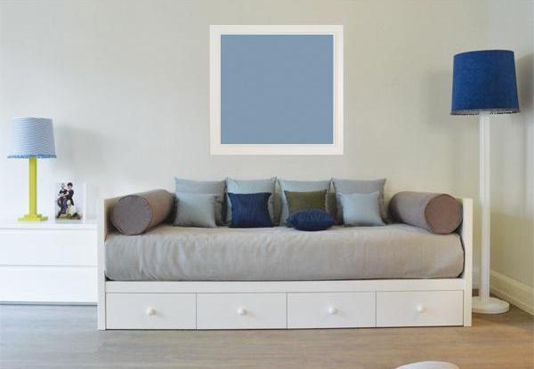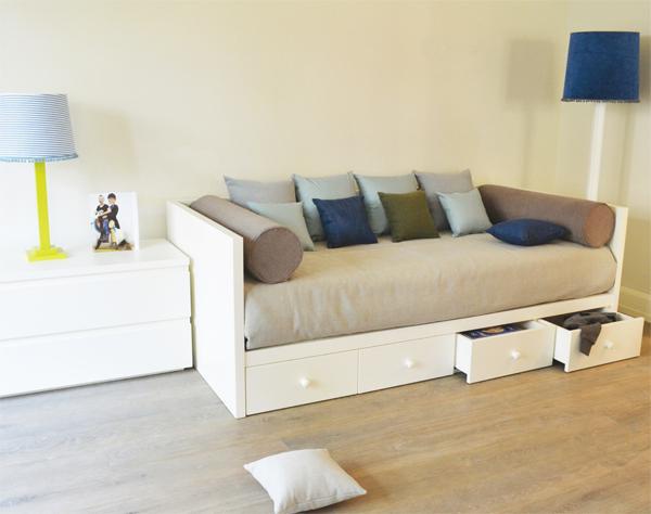 A double sofa from Italian manufacturer Anna Baby Room. The model includes four drawers. The body is made of solid wood. Finish - white lacquer. Upholstery textile from the catalogue of the factory. In addition, you can purchase a table of similar design.