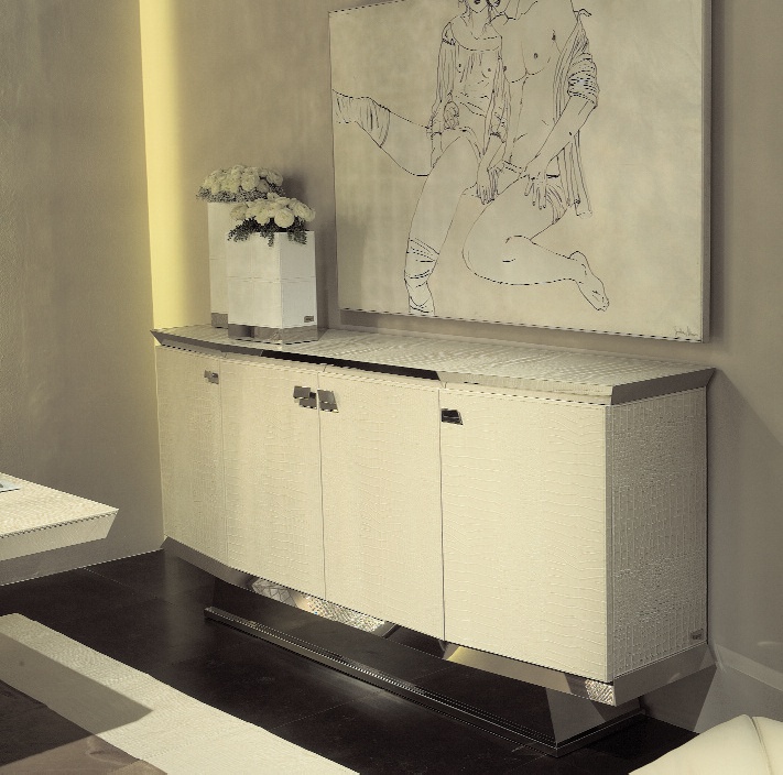 A snack bar with leather upholstery Morgana from the Italian manufacturer Rugiano. Model with 4 hinged doors. The frame is made of wood. Available in leather and solid rosewood in combination with leather, colors to be selected from the range of the factory. Inside the sideboard is equipped with drawers and shelves for storage. Base high, in the form of a trapezoid, in the finishing of steel or bronze. Great for living room or dining room in modern style with elements of glamour and art Deco.