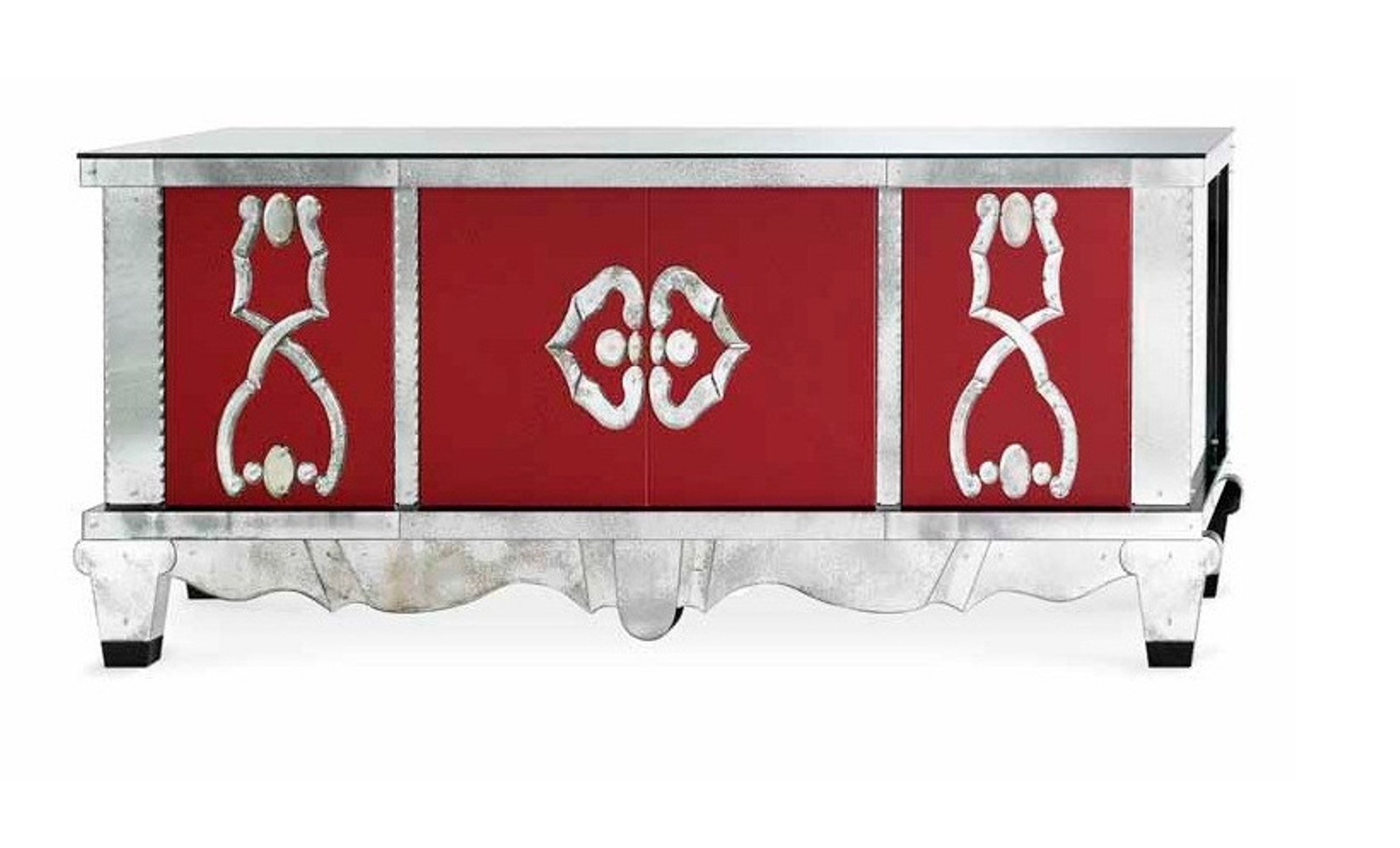 Chest of the Italian manufacturer Arte Veneziana. Chest on four small feet with two swing doors. The model is silver with red inserts on the doors. Made in the style of art Deco.