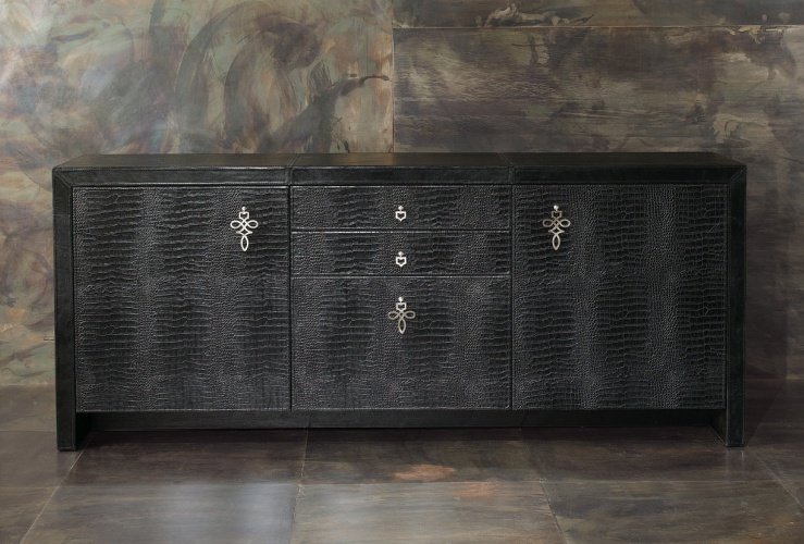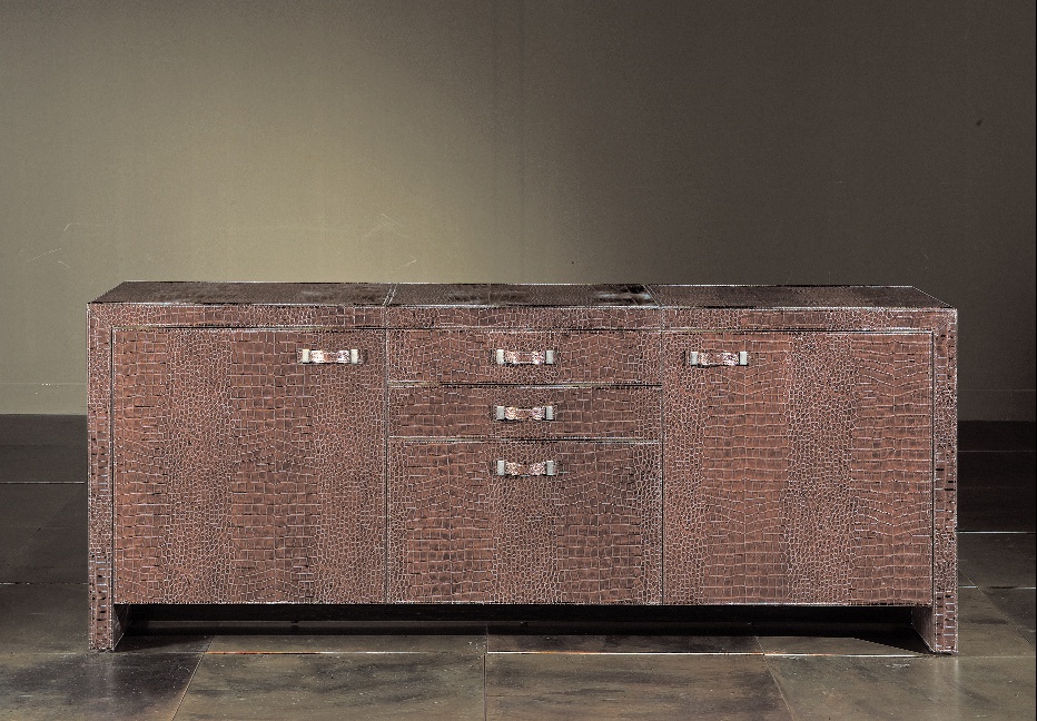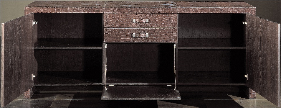 A snack bar with leather upholstery Ravie - Rugiano. A model with drawers, made of solid wood, upholstered with crocodile leather, snake skin and leather. The buffet will be a great addition to Your living room fusion.