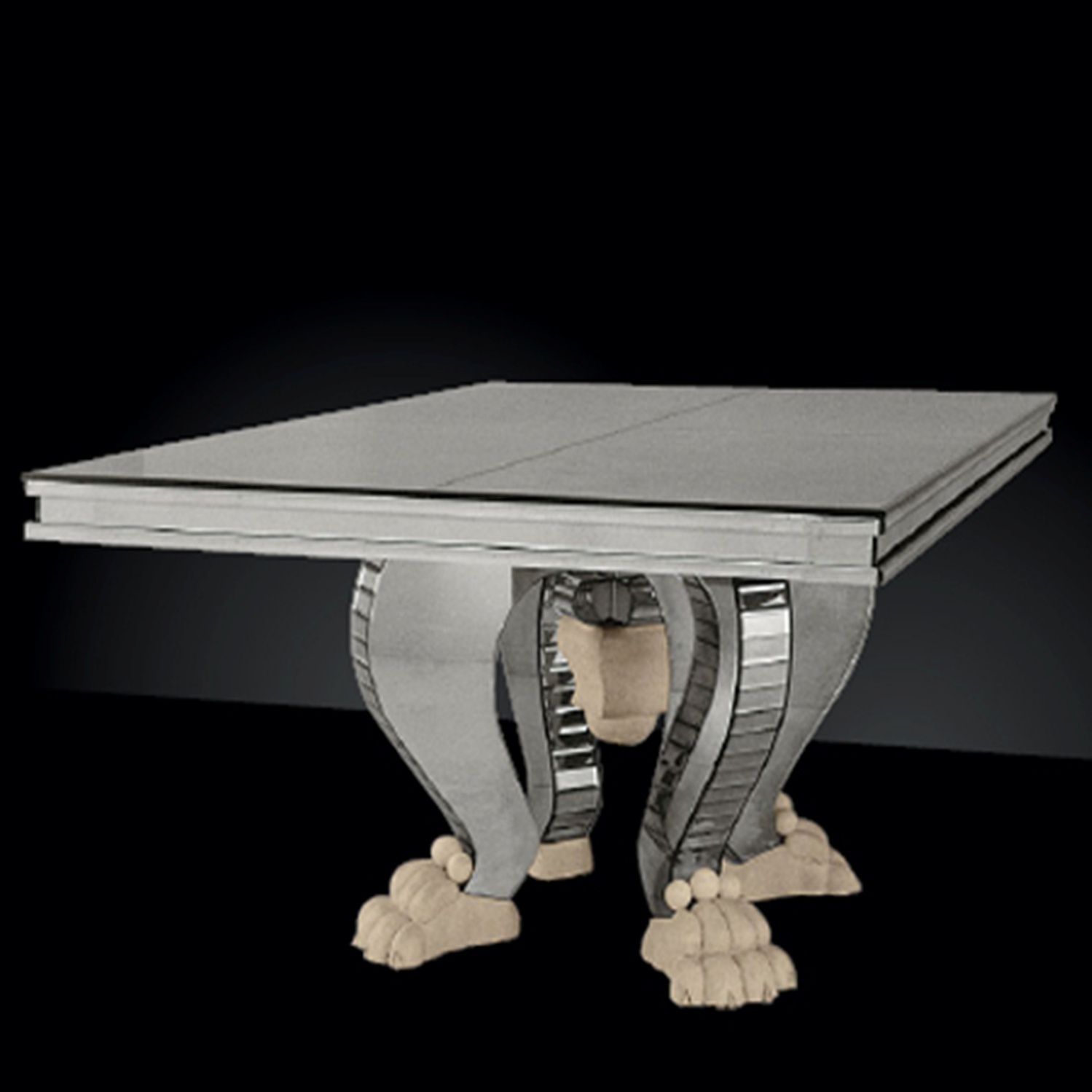 Dining table from the Italian manufacturer Arte Veneziana. The table is made of wood. Legs are figured decorated with Golden elements in the form of paws. The model is fully mirrored. Colour silver with gold decorative elements accentuate the style of art Deco.