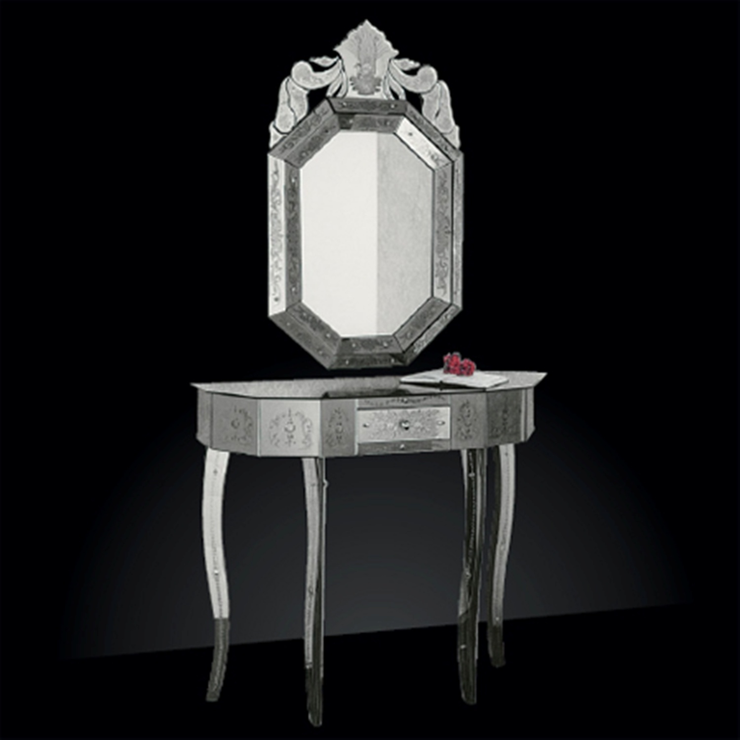 The console of the Italian manufacturer Arte Veneziana. Console semi-circular form on four curly feet. The model is fully mirrored. Decorative painted elements contribute to the style of art Deco.