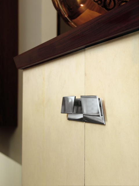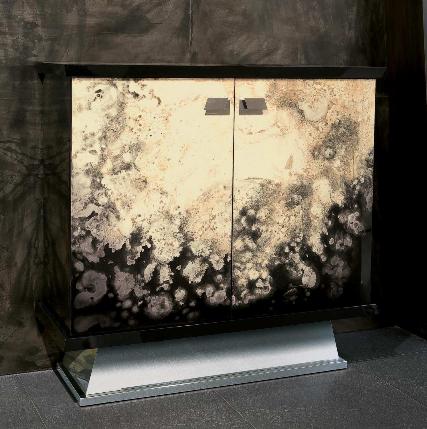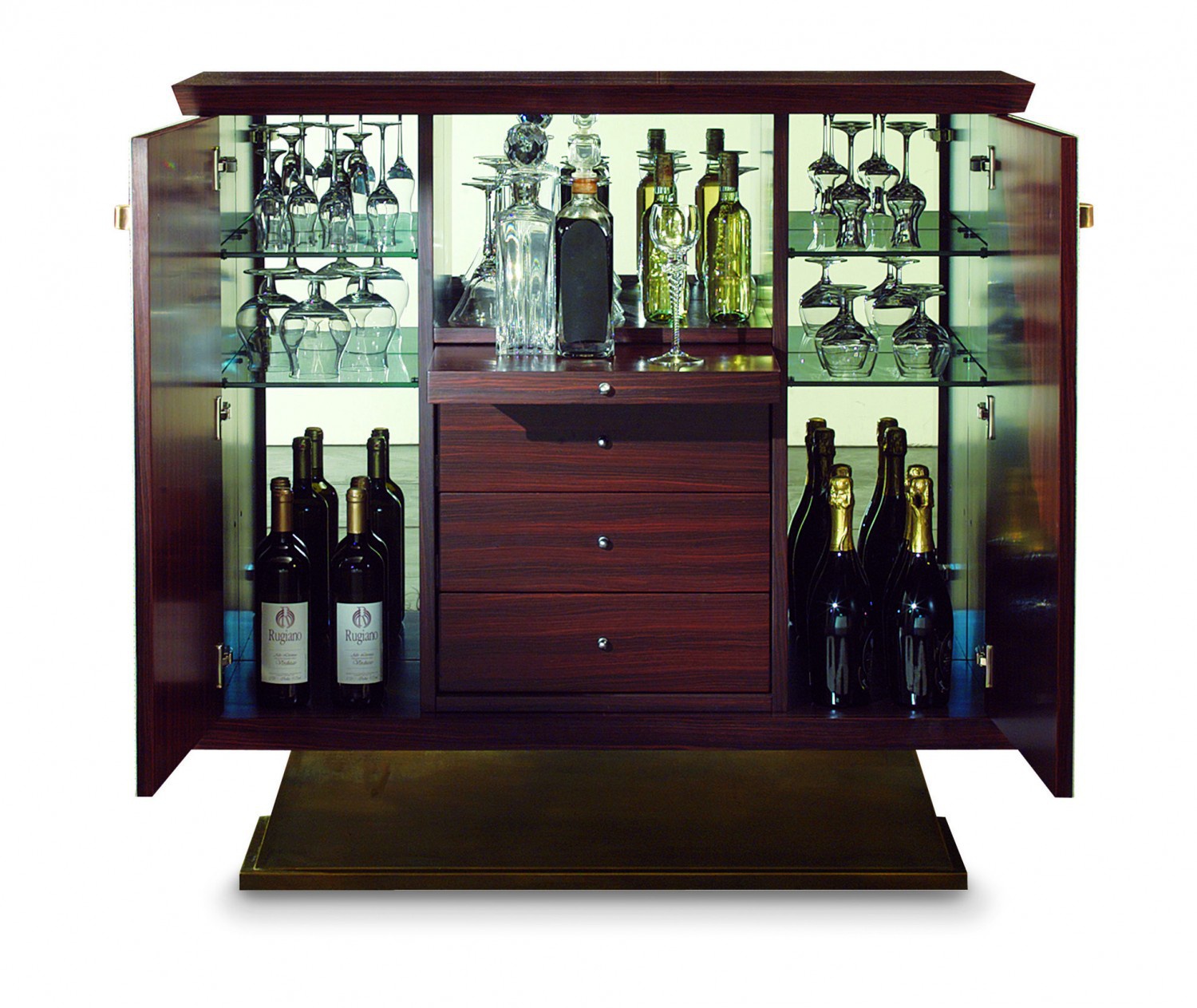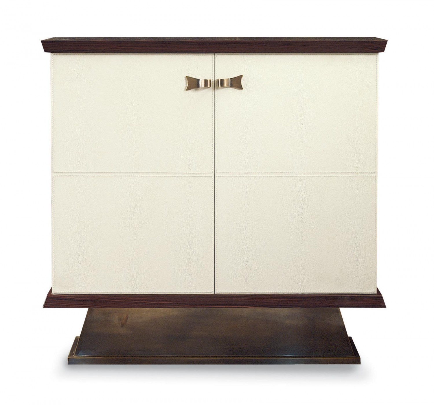 Bar Manhattan from the Italian manufacturer Rugiano. The model with two hinged doors. The frame is made of wood, finished with glossy varnish, leather or rosewood. The door is decorated with a decorative pattern, if you wish, you can offer your decor. Inside the sideboard is equipped with drawers and glass shelves for storage. The base is made from bronze or steel. Great, unique option for living room, dining room or bar in modern style with elements of glamour and art Deco.