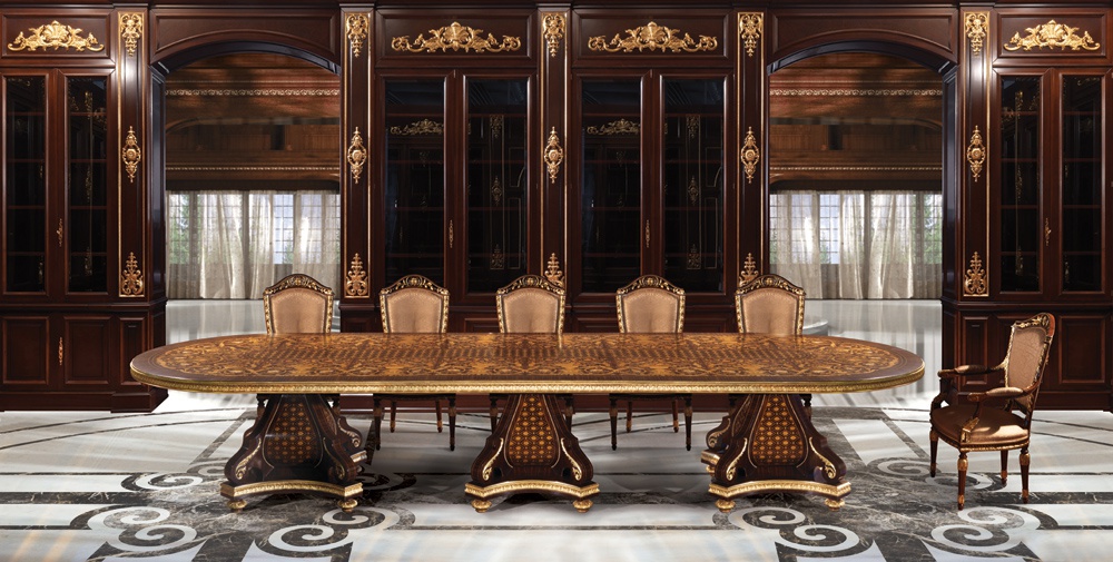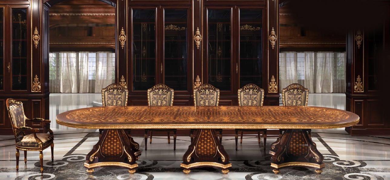 Set for the dining room from Italian manufacturer Ezio Bellotti. Includes dining table with oval table top and chairs. Frames made of solid wood. Finish - gloss lacquer and gilding. Chairs upholstered in textiles. Colors to choose from for the company directory. Made in a classic style.