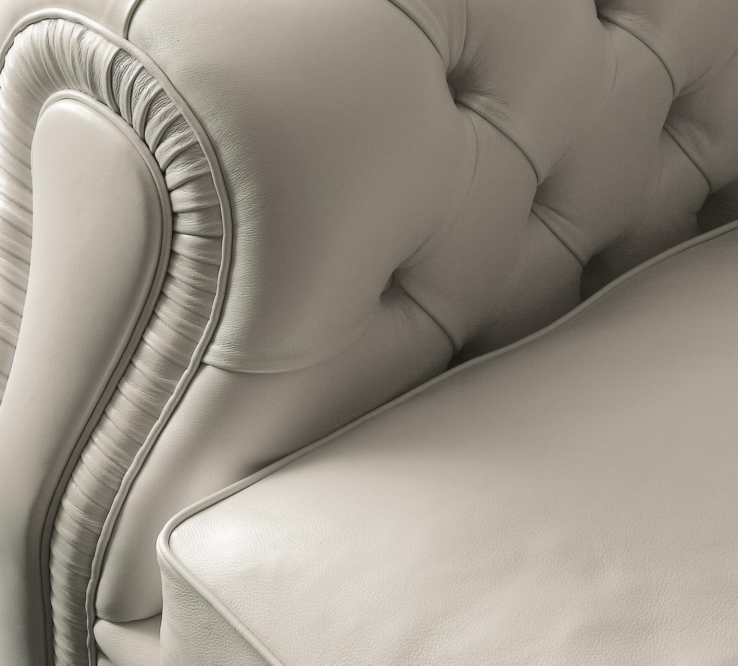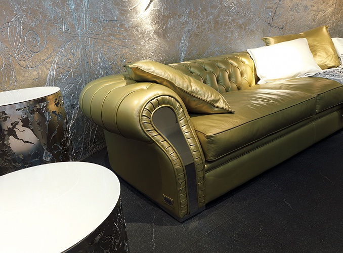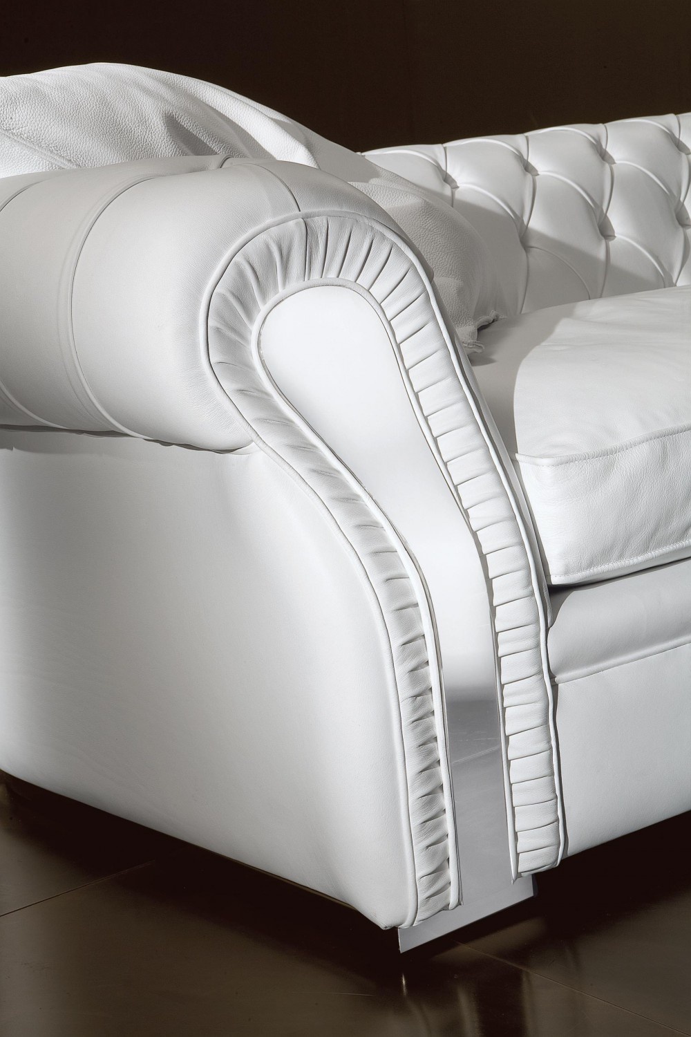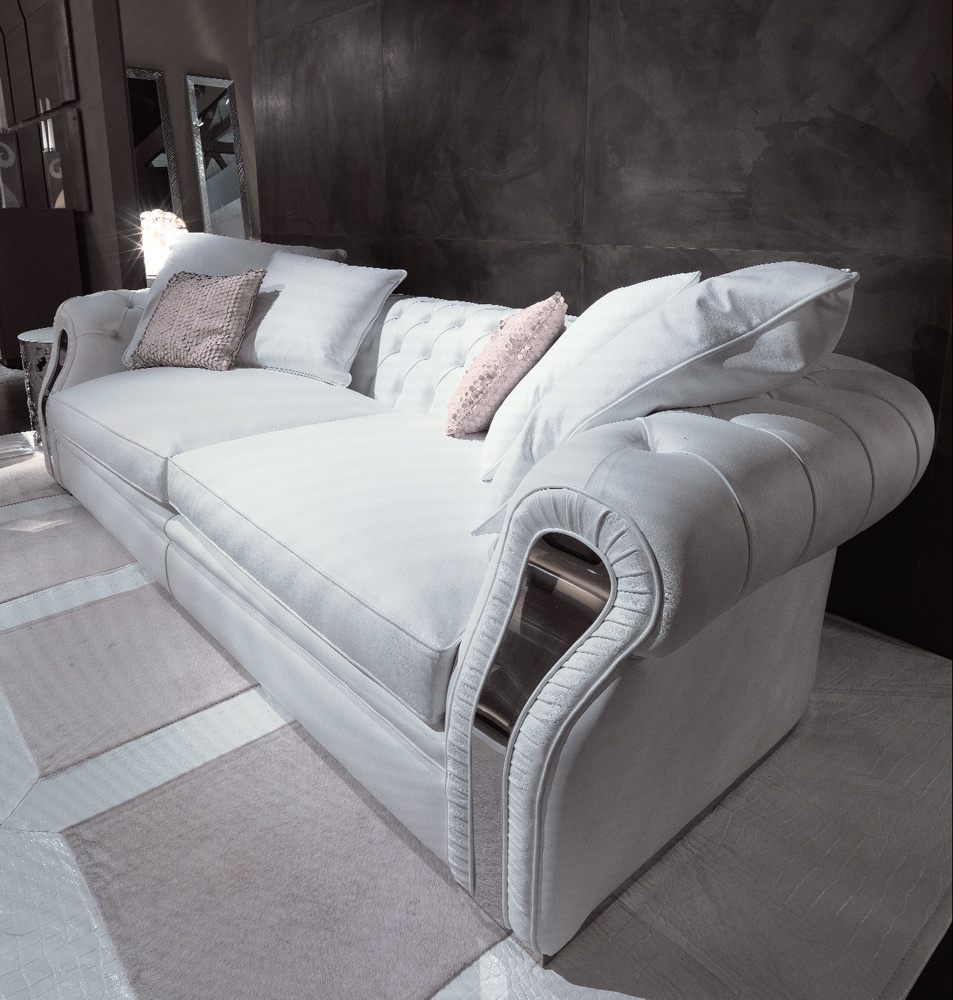 Double and triple sofa Nirvana, from the Italian manufacturer Rugiano. The model with the original line of bending of the backrest and armrests. The sofa is decorated with stitch-Capito. The armrests can be made with inserts of steel or leather. Upholstered in textile or leather, color to be selected from the company directory. At the base of the solid wood, filler - polyurethane foam of different densities. The design of complementary decorative pillows.