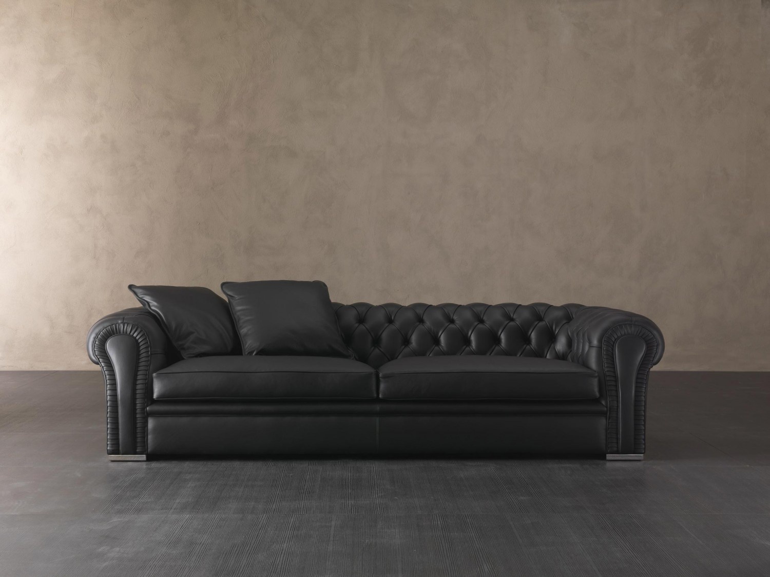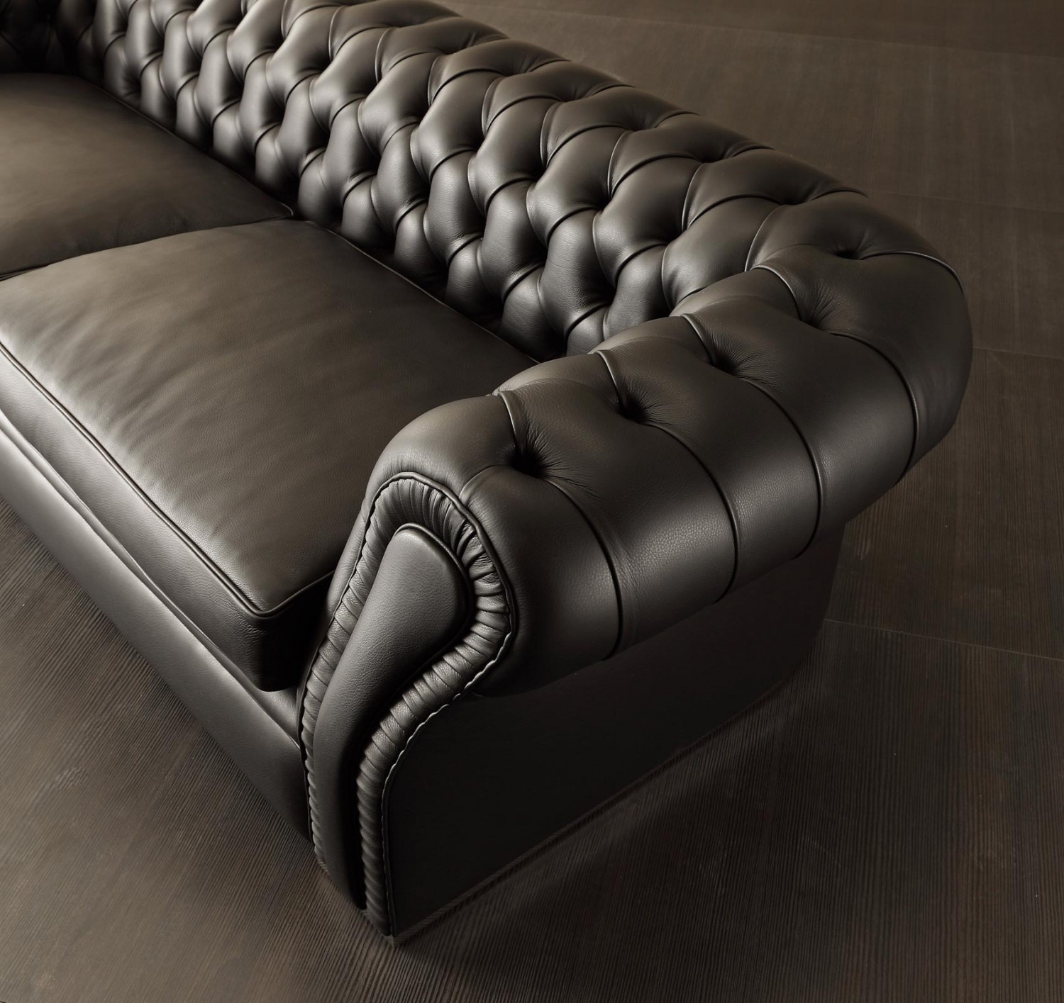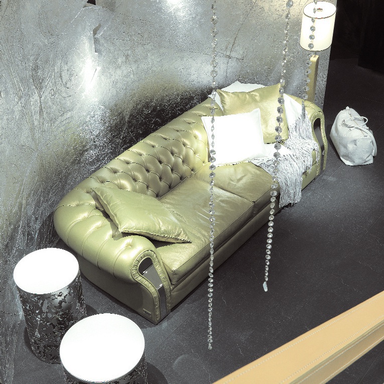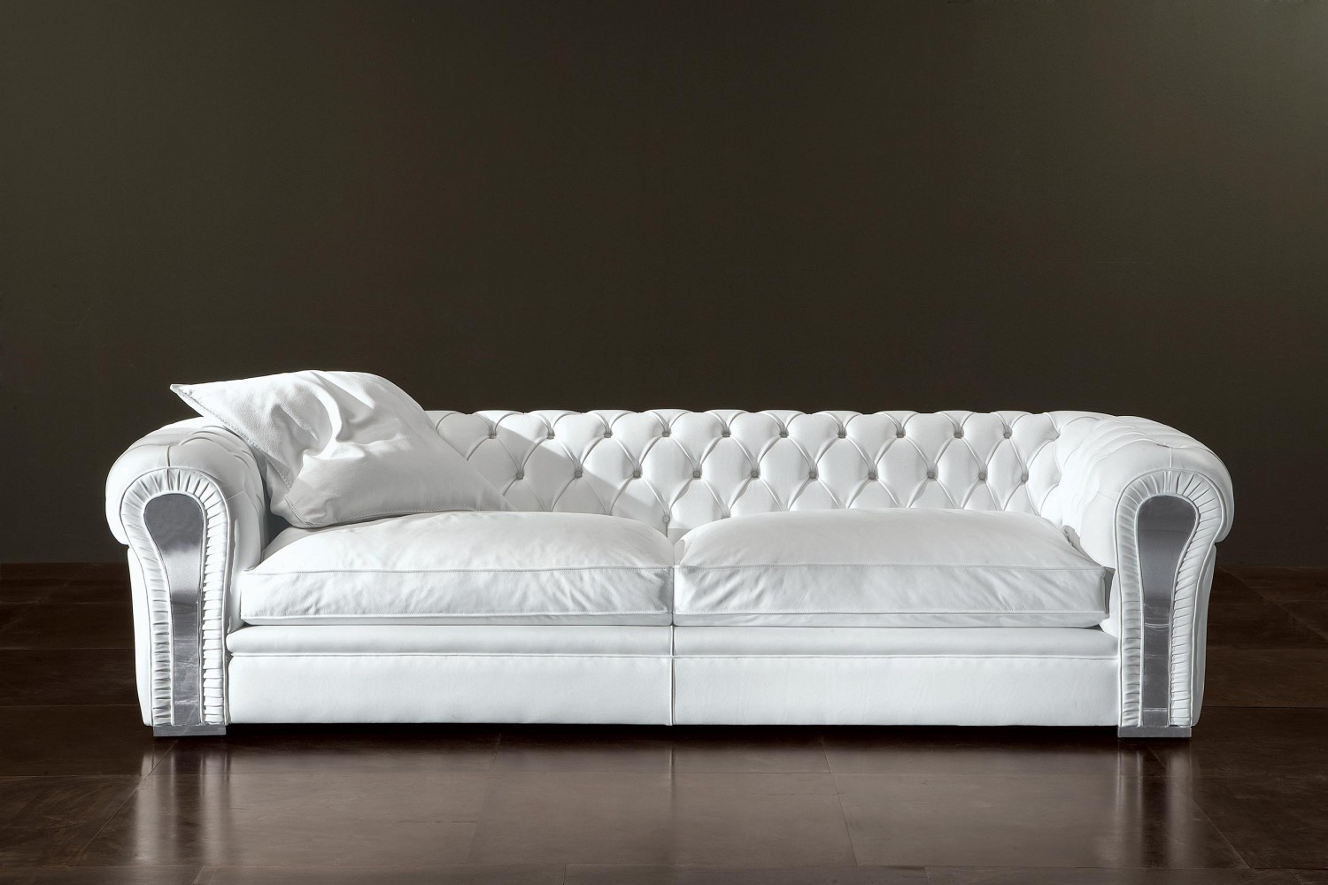 Double and triple sofa Nirvana, from the Italian manufacturer Rugiano. The model with the original line of bending of the backrest and armrests. The sofa is decorated with stitch-Capito. The armrests can be made with inserts of steel or leather. Upholstered in textile or leather, color to be selected from the company directory. At the base of the solid wood, filler - polyurethane foam of different densities. The design of complementary decorative pillows.