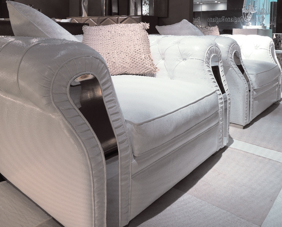 The Nirvana chair from the Italian manufacturer Rugiano. The model with the original line of bending of the backrest and armrests. The chair is decorated with stitch-Capito. The armrests can be made with inserts of steel or leather. Upholstered in textile or leather, color to be selected from the company directory. At the base of the solid wood, filler - polyurethane foam of different densities. The design complements the decorative pillow.