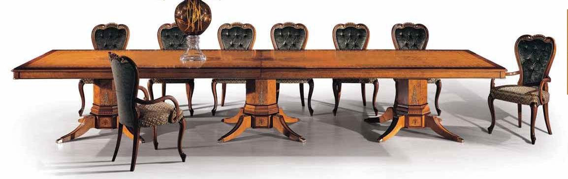 Set for the dining room from Italian manufacturer Ezio Bellotti. Consists of dining table and chairs. Material - solid wood. The surface is covered with varnish. Chairs with armrests. Upholstery textile. Colours in stock.
