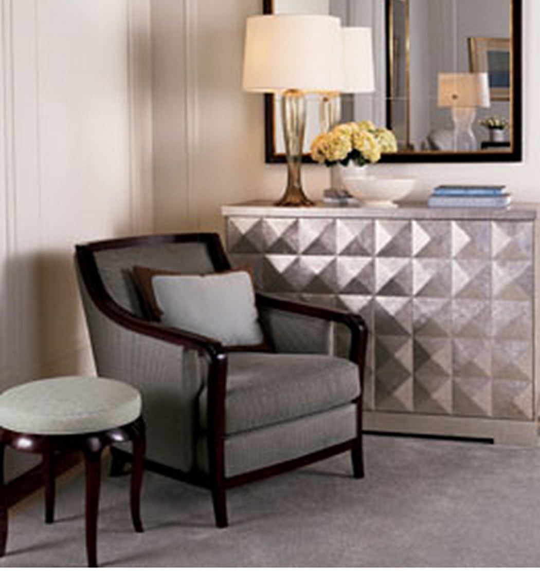 Chair American manufacturer of Barbara Barry. The model is made in art Deco style. Round chair on low legs and back fades into the armrests. The frame is made of wood. Upholstered in bright, high-quality textiles, colors to choose from the range of the manufacturer.