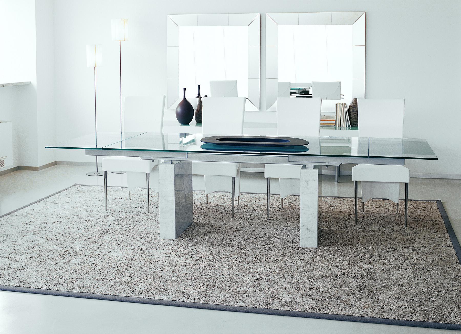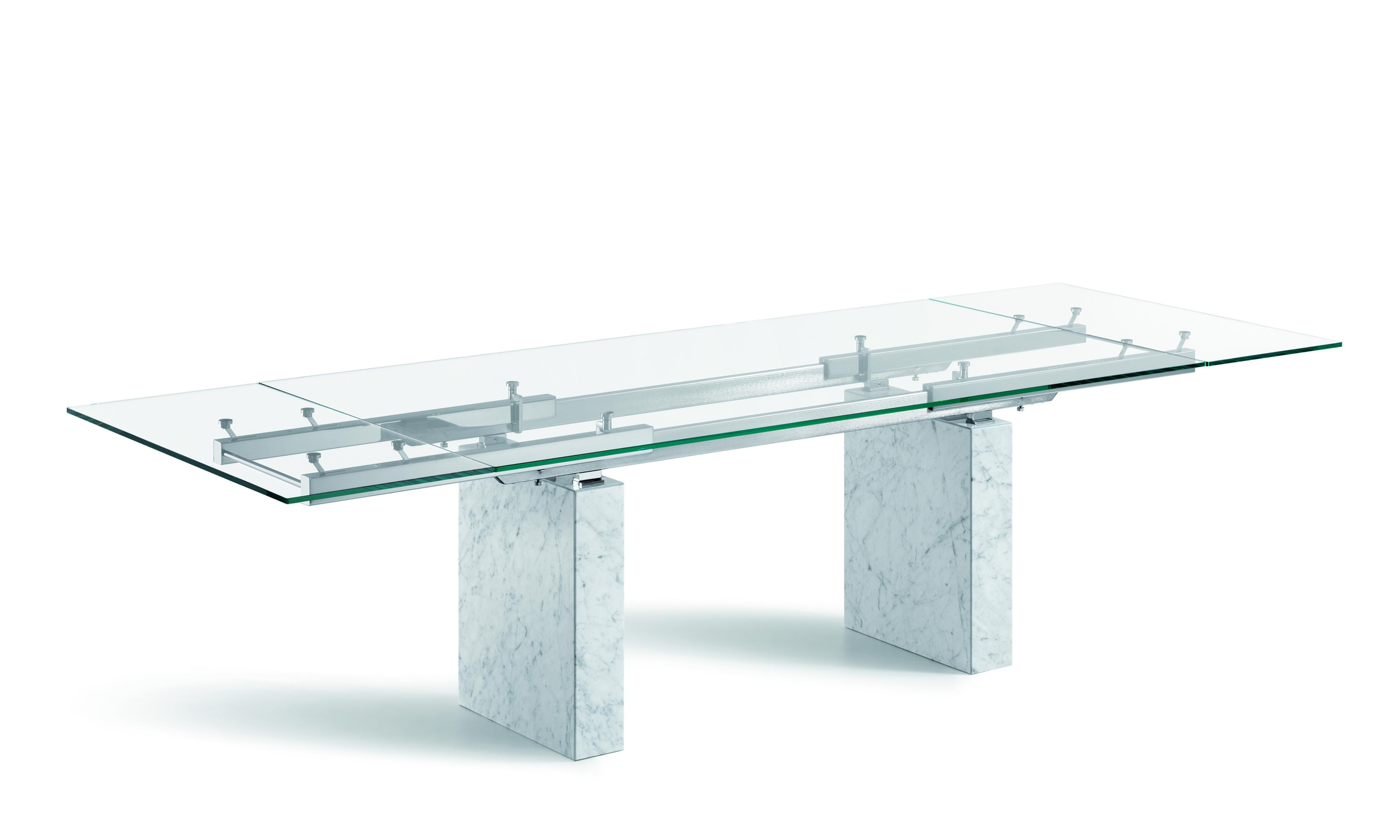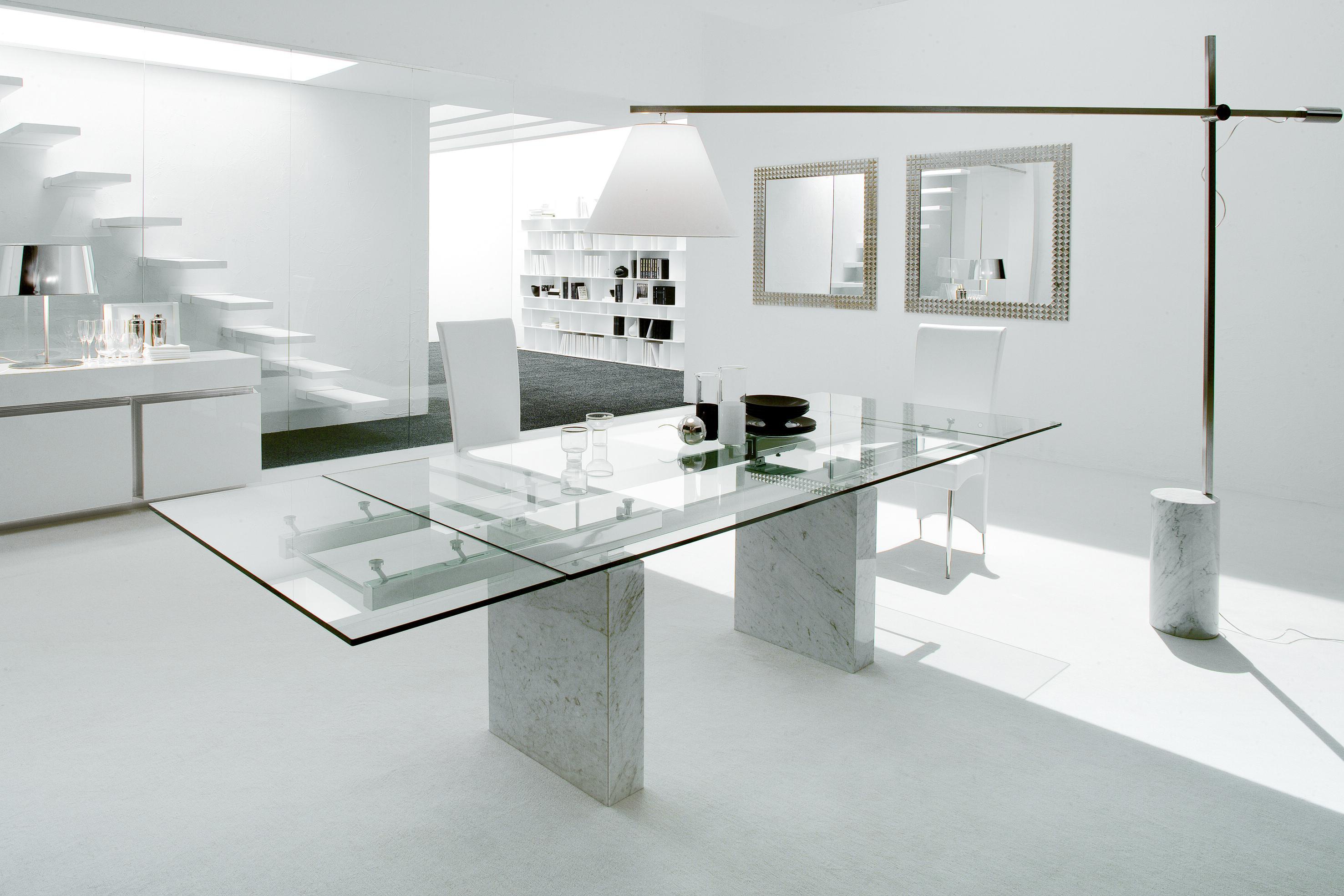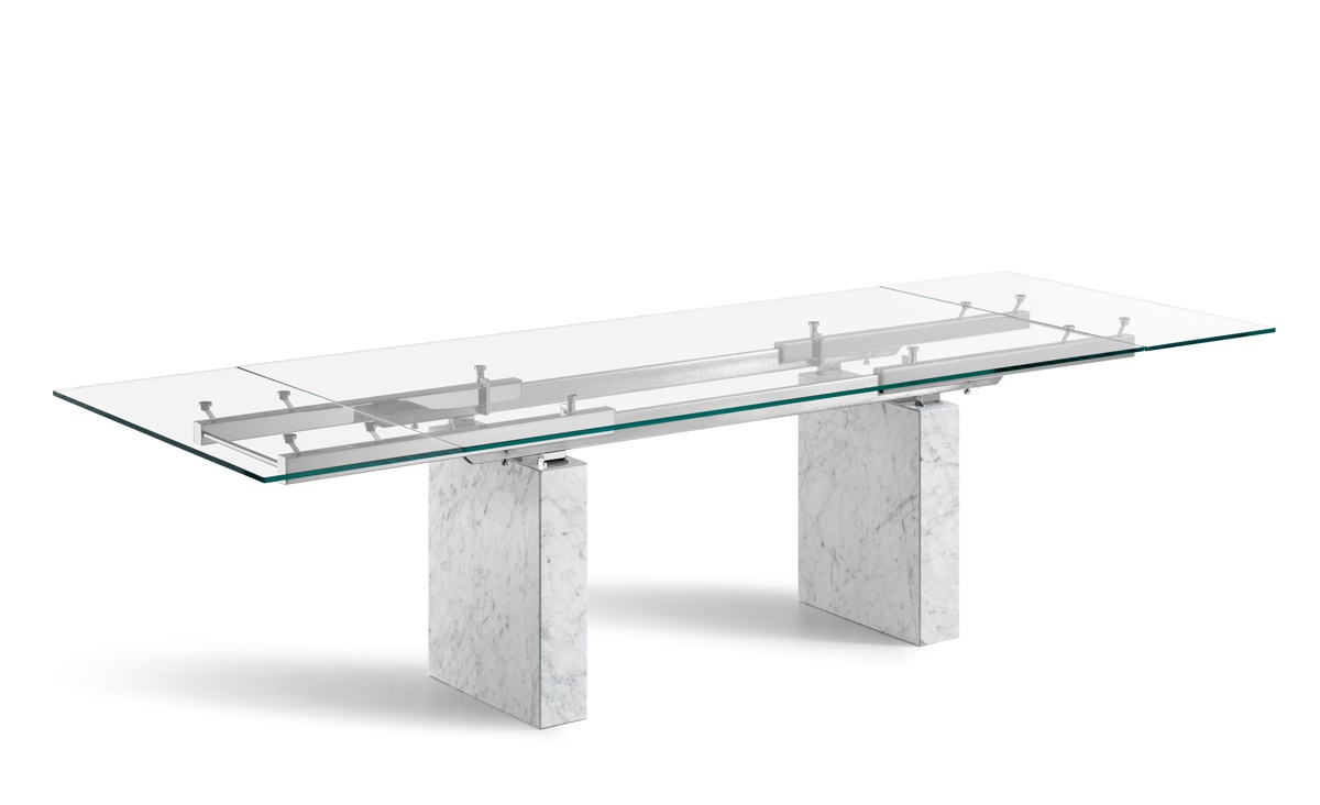 Zeta dining table from Italian manufacturer Cattelan Italia. Extendable table with base in Travertine, white Carrara marble, black Marquinia marble. Countertop and sliding parts made of transparent glass 12 mm, frosted mixed glass, black glass or white painted clearly evident and transparent glass. Rails of chrome-plated or painted white or black steel. The model is made in modern style.