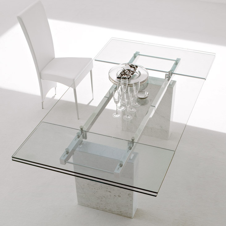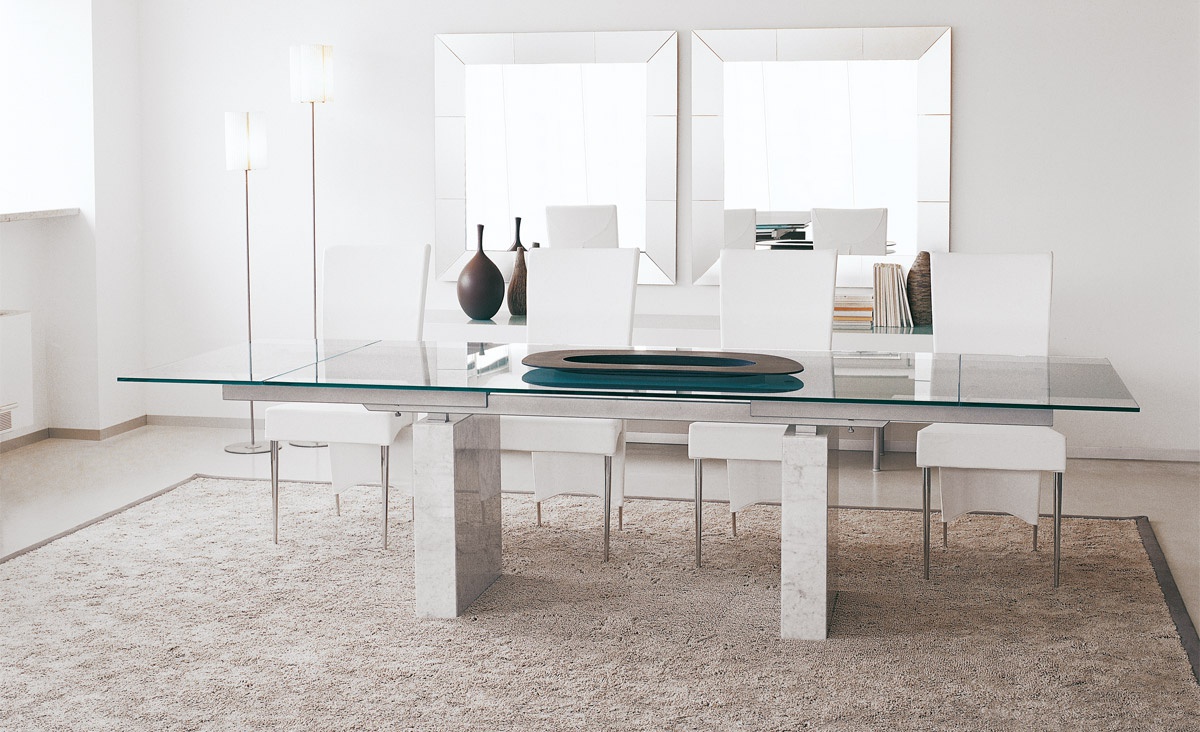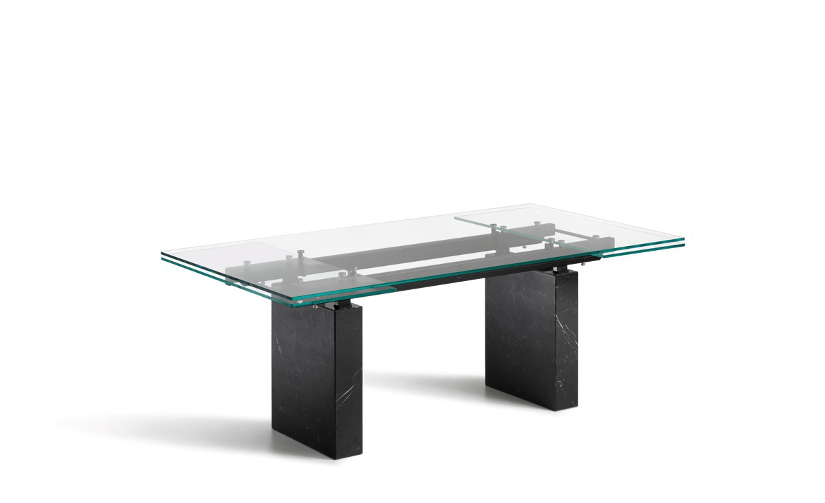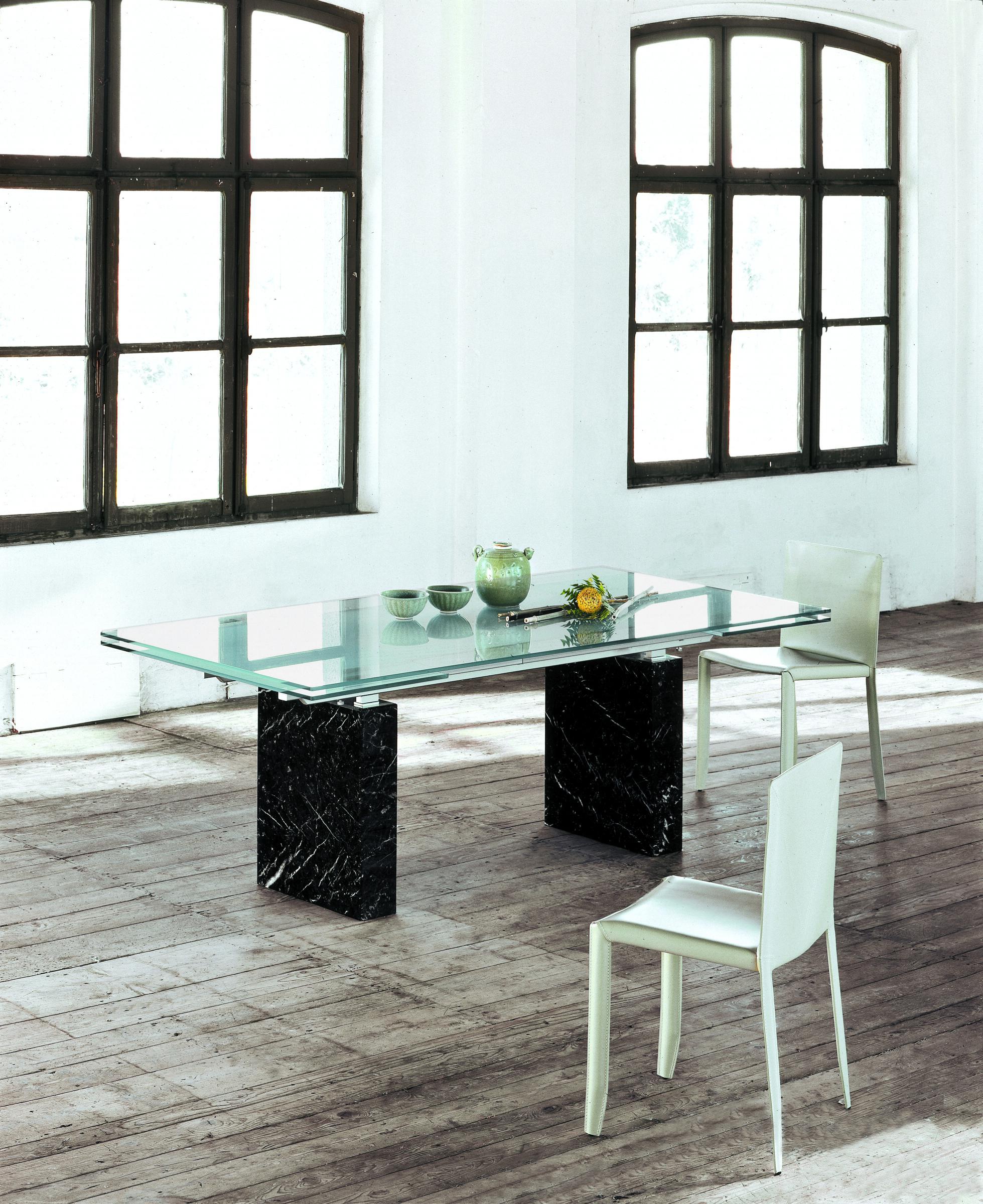 Zeta dining table from Italian manufacturer Cattelan Italia. Extendable table with base in Travertine, white Carrara marble, black Marquinia marble. Countertop and sliding parts made of transparent glass 12 mm, frosted mixed glass, black glass or white painted clearly evident and transparent glass. Rails of chrome-plated or painted white or black steel. The model is made in modern style.
