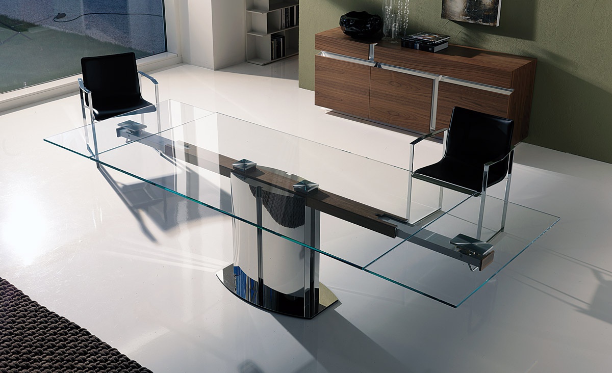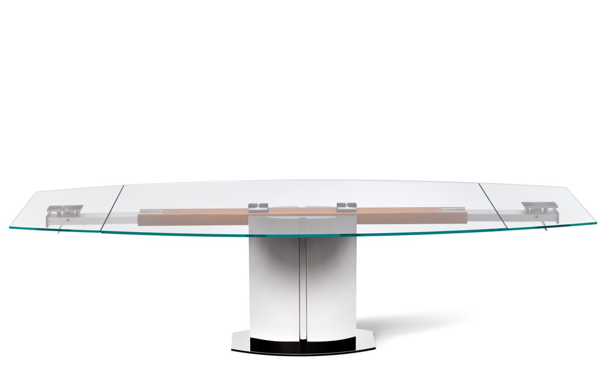 Dining table Ocean Drive from the Italian manufacturer Cattelan Italia. The model is made in modern style. Extending table with glossy stainless steel. Countertop and sliding parts made of transparent glass or clearly evident and transparent tempered glass 15 mm (sliding parts 12 mm). The rails of glossy stainless steel and aluminum / walnut Canaletto or wenge, and aluminum. Colours in stock.
