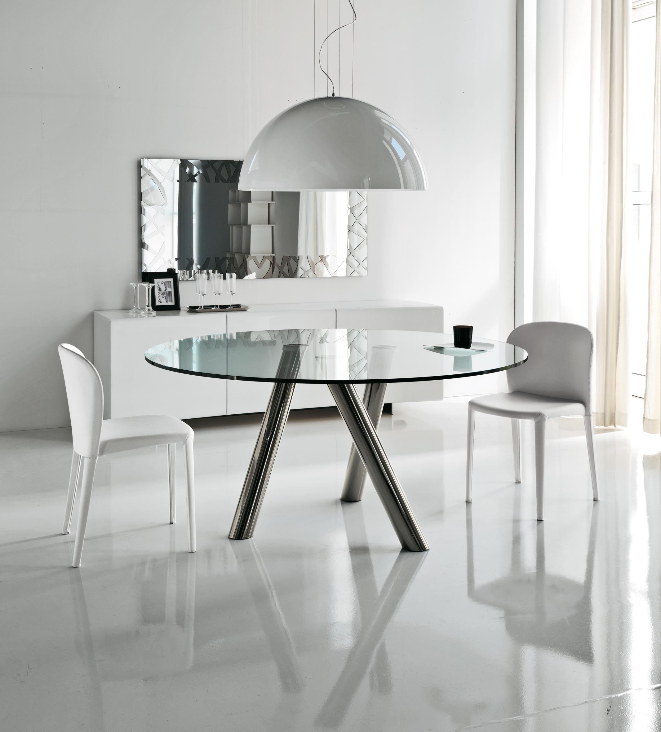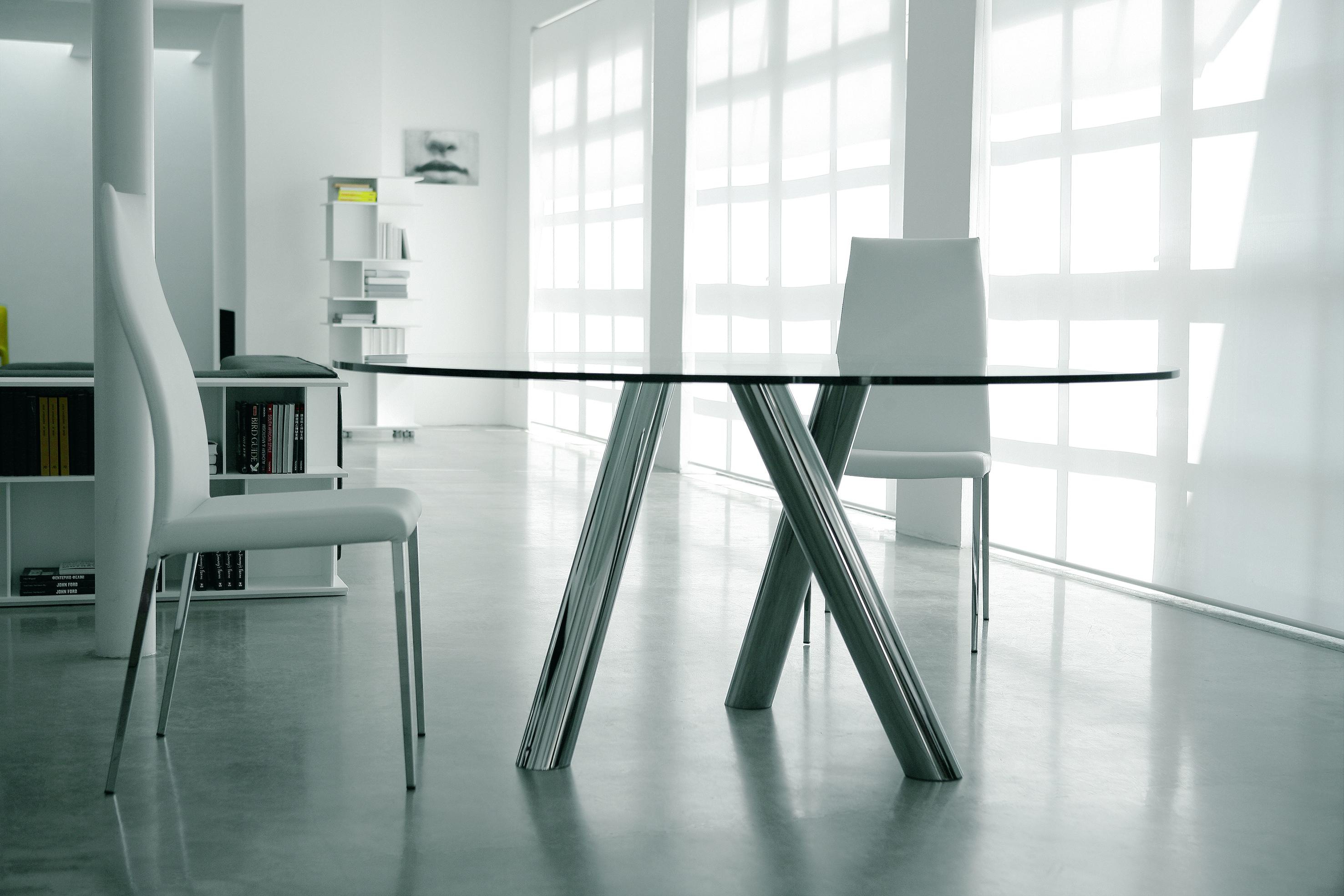 Ray dining table from Italian manufacturer Cattelan Italia. Legs of chromed steel, black chrome or upholstered in leather. The table top of transparent tempered glass 15 mm. the Model is made in modern style. Colours in stock.
