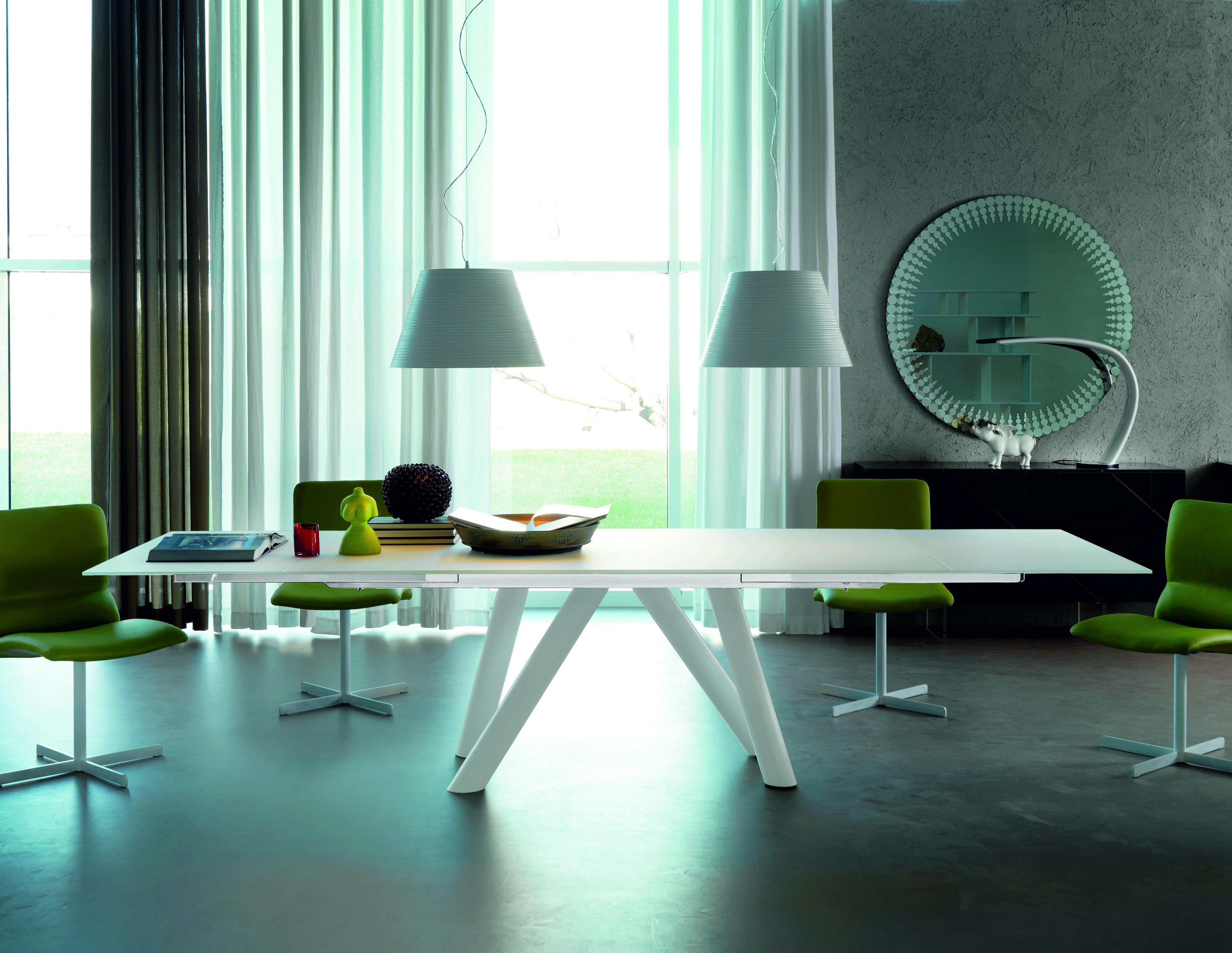 Dining table Ray Drive from the Italian manufacturer Cattelan Italia. Folding table with chromed steel base or Matt white lacquer. Table top and extensions made clearly evident and transparent glass 10 mm. the Model is made in modern style. Colours in stock.