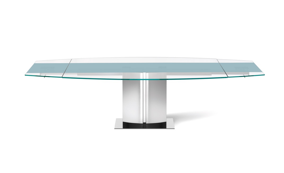 Dining table Rodeo Drive from the Italian manufacturer Cattelan Italia. Extending table with glossy stainless steel countertop and sliding parts of mixed clear / white glass or with a base of wenge and the tabletop and sliding parts of mixed clear / brown glass. The table top is 12 mm at the base. The model is made in modern style.